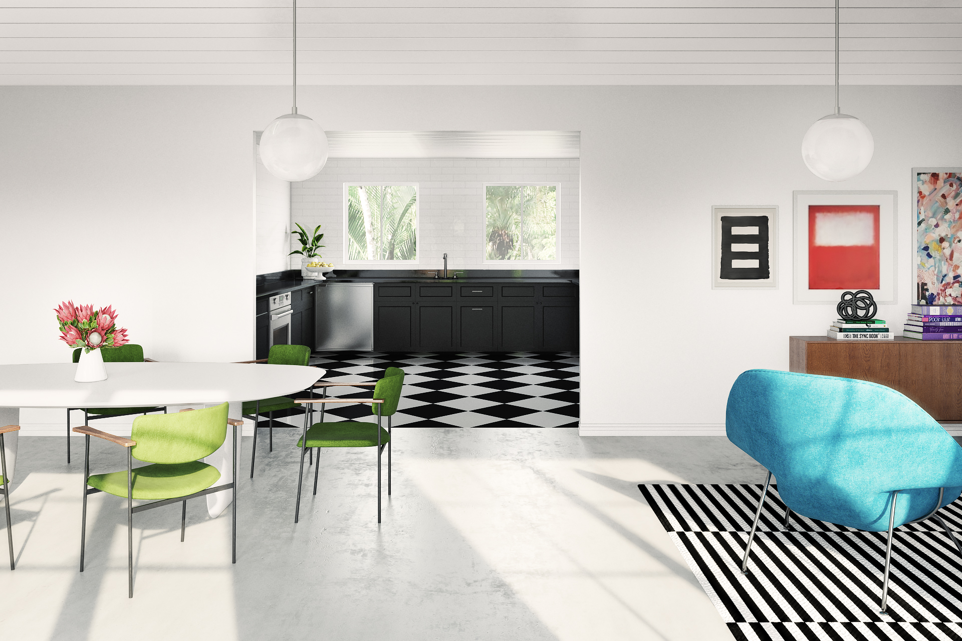 The dining area is quite long in length and it was a top priority to find a table that wouldn’t feel dwarfed in the space. This white rounded table is actually made entirely of concrete and was our first choice! I loved the idea of adding just a touch of color in this area with the addition of the green dining chairs. We felt that they worked so nicely with all the palm trees that over hang the pool area outside.