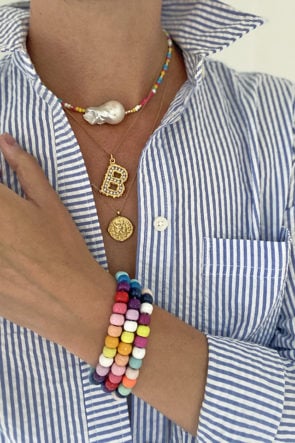 Left: Necklaces: Mathe (also love this one) – Pacharee – Missoma // Bracelets: Baublebar (sold out, but love these personalized ones) // Top: J.Crew