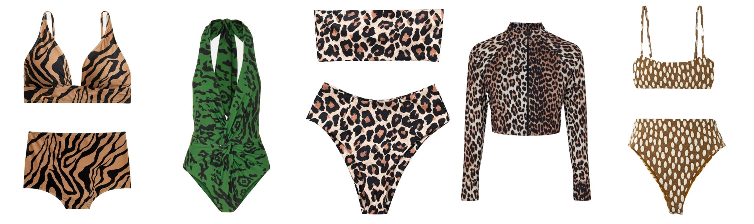 Zebra Suit Top, Bottom // Green Leopard Halterneck Suit // Strapless Leopard Bikini // Leopard Long Sleeved Swim Top // Jacquard Dotted Bikini Top, Bottom