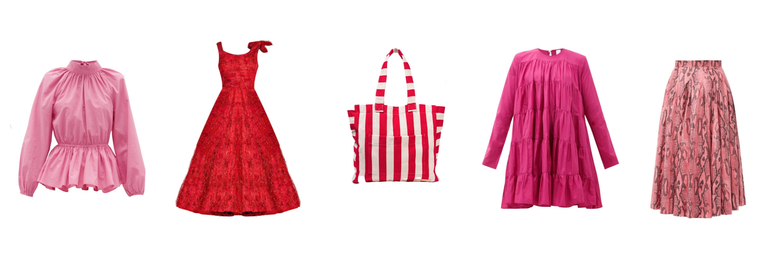Pink High-Neck Cotton Blouse // Red Midi Gown // Striped Cotton Tote // Dark Pink Tiered Cotton Mini Dress // Pink Snake-Print Midi Skirt