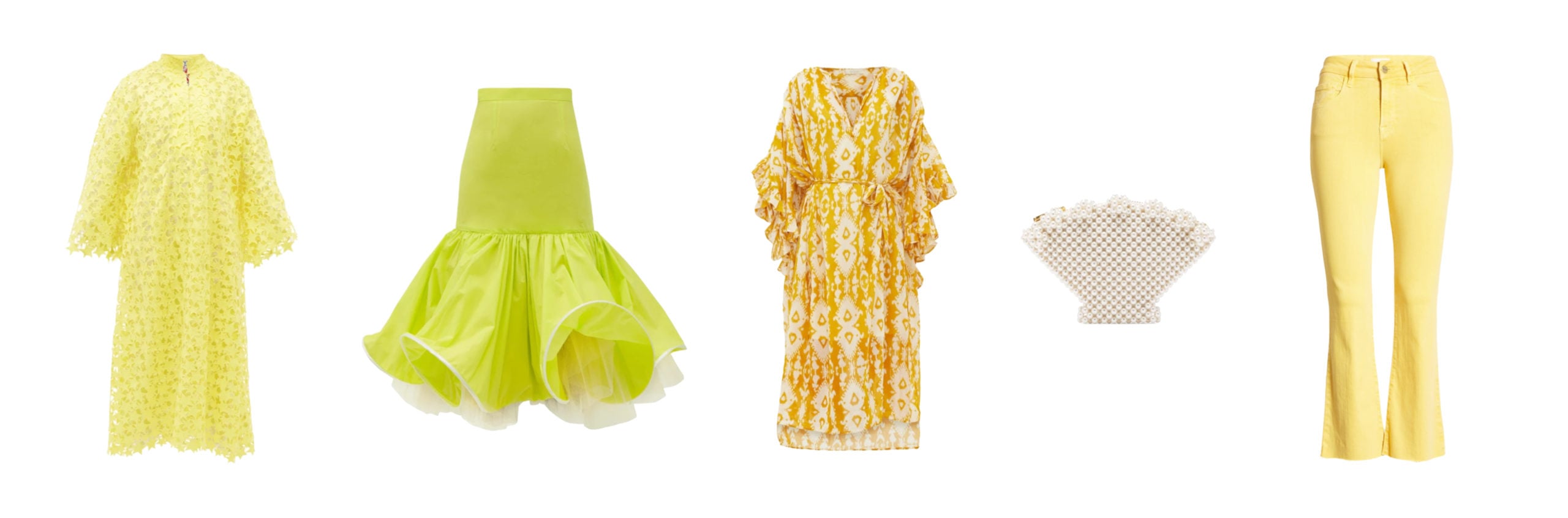 Yellow Lace Kaftan Dress // Green Fluted Poplin Skirt // Ikat Print Cotton-Voile Dress // Shell Faux-Pearl Embellished Clutch // Yellow Cropped Flare Jeans