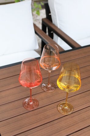ESTELLE // As you are well aware, I love color, so these chic, colorful glasses were a total no brainer. I decided to make my own set of six and surprise, surprise I went with a rainbow theme! Here I’m showing the blush pink, yellow, and coral peach pink!