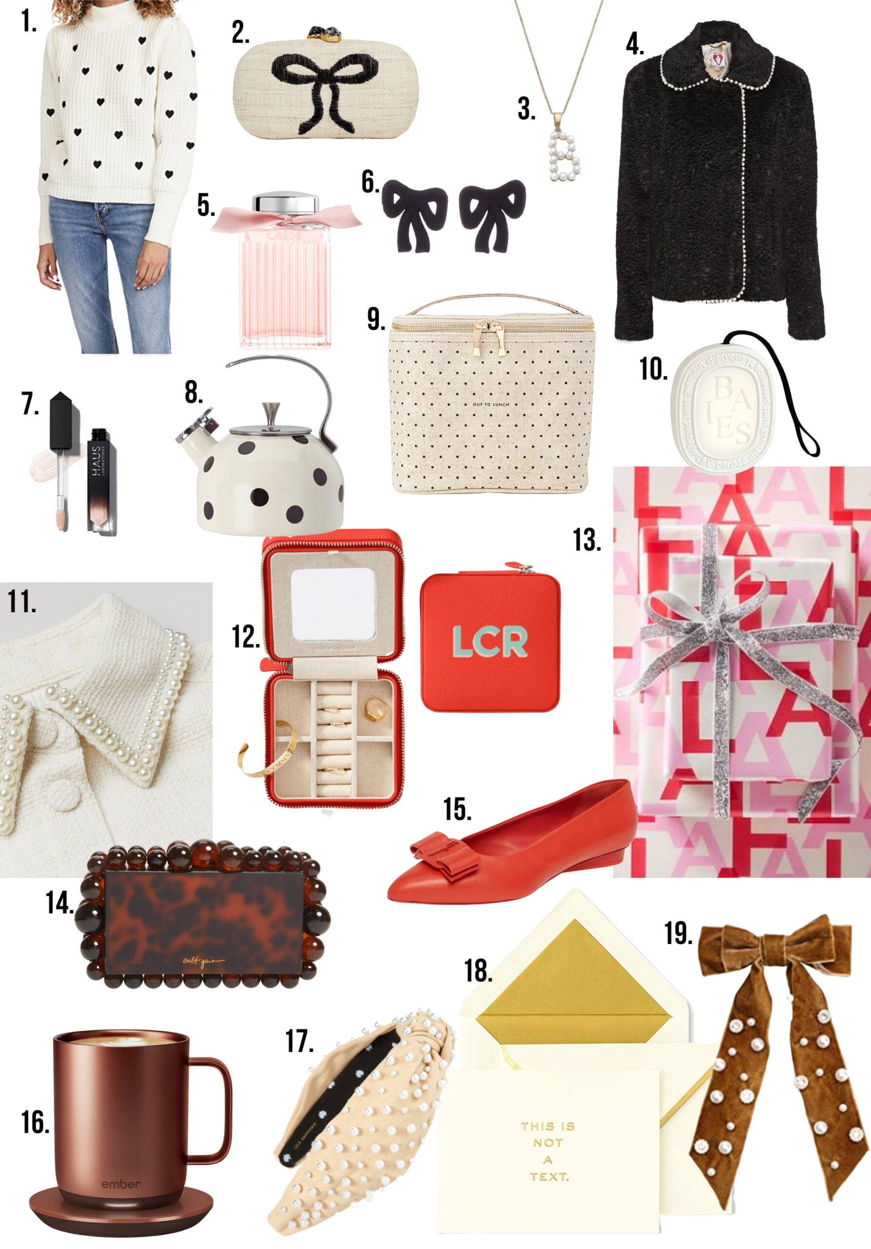 // 1. Heart Flocked Sweater // 2. Bow Minaudiere // 3. Pearl Initial Necklace // 4. Pearl Faux Fur Coat // 5. Rose Perfume // 6. Bow Earrings // 7. The Perfect Gloss // 8. Polka Dot Kettle // 9. Polka Dot Lunch Box // 10. Solid Room Perfume // 11. Pearl Collar Coat // 12. Monogrammed Jewelry Case // 13. The Cutest Wrapping Paper // 14. Tort Clutch // 15. Bow Flats // 16. Heated Coffee Mug // 17. Pearl Headband (on super sale) // 18. Snail Mail // 19. Velvet Hair Bow