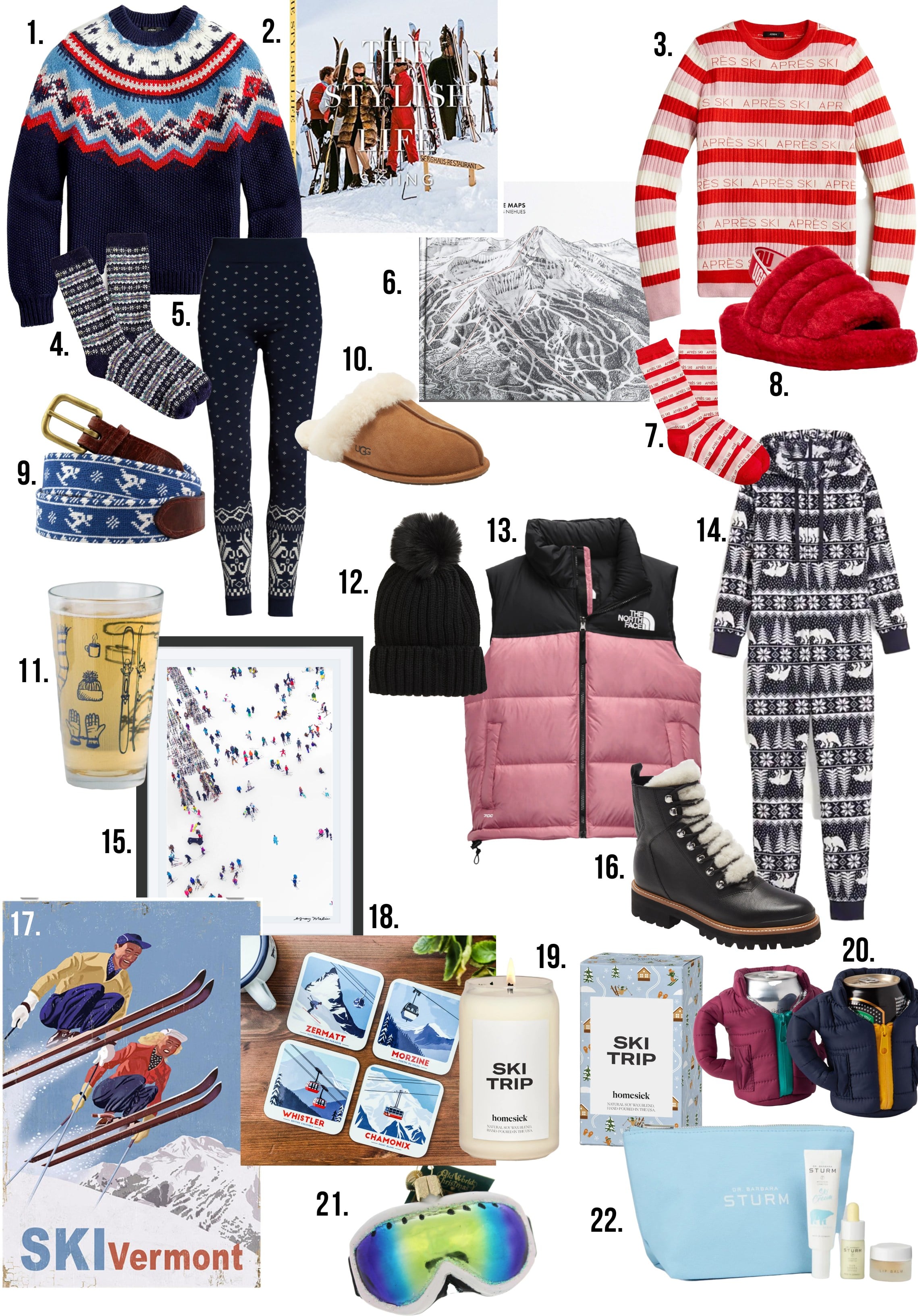 // 1. Fair Isle Sweater // 2. Stylish Life: Skiing // 3. Après Ski Sweater // 4. Festive Fair Isle Socks // 5. Base Layer Leggings // 6. Ski Map Book // 7. Après Ski Socks // 8. Plush Slipper Sandals // 9. Needlepoint Skier Belt // 10. Suede Slide Slipper // 11. Ski Tools Pint Glass // 12. Cozy Classic Pom Beanie // 13. Packable Down Vest // 14. Fair Isle One-Piece Pajamas // 15. Ski Racks Print // 16. Shearling Lace-Up Boot // 17. Vintage Ski Print // 18. Ski Lift Coasters // 19. Ski Trip Candle // 20. Puffer Jacket Koozie // 21. Ski Goggles Ornament // 22. Ski Essentials Beauty Kit