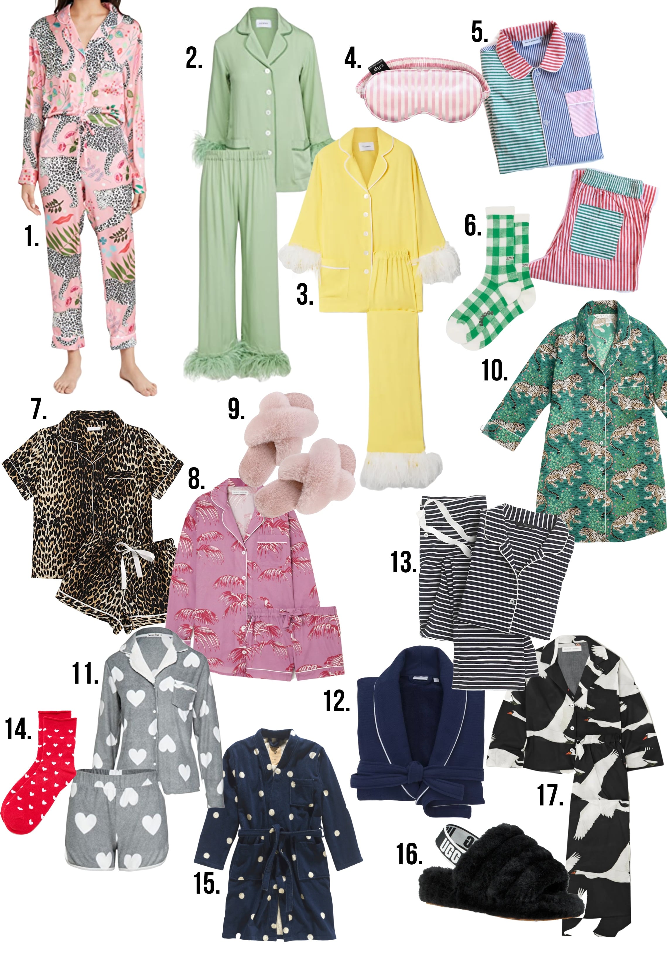 // 1. Pink Print PJs // 2. Green Feather PJs // 3. Yellow Feather PJs (on sale) // 4. Stripe Eyemask // 5. Stripe Mix PJ Set // 6. Gingham Socks // 7. Leopard Short Set // 8. Pink Palm Print Short Set // 9. Cozy Slippers // 10. Green Animal Print Sleep Shirt // 11. Heart Print Set // 12. Waffle Robe // 13. Stripe Long Set // 14. Heart Socks // 15. Polka Dot Robe // 16. My Favorite Slippers! // 17. Swan Print Set