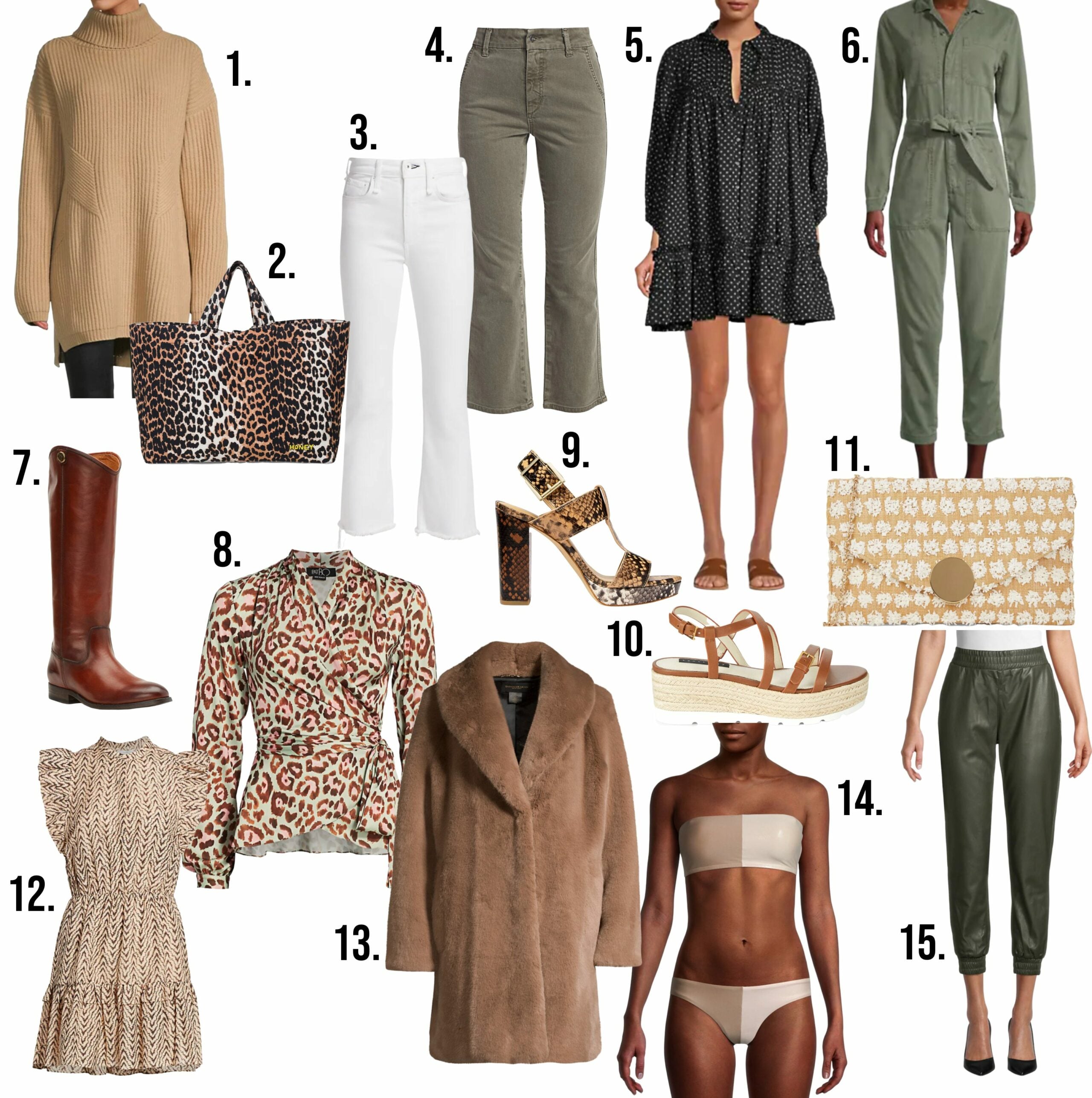 // 6. Green denim jumpsuit // 7. Leather boots // 8. Leopard print wrap top // 9. Snakeskin slingback sandals // 10. Platform espadrilles //