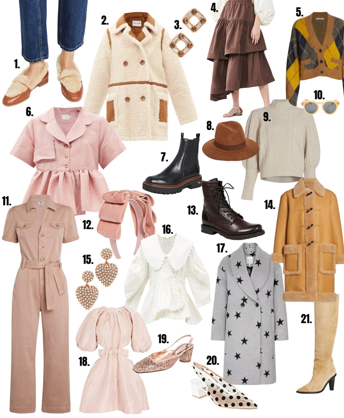 11. Blush Jumpsuit // 12. Bow Headband // 13. Lace Up Boot // 14. Shearling Trim Coat // 15. Heart Pearl Earrings