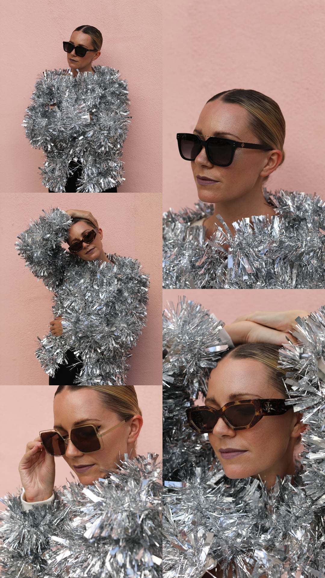 What to pair these with: These shades are perfectly paired with your favorite velvet suit, bow blouses, and square toed boots. The glamorous shape and proportions also have me styling these with a dramatic printed maxi dress and OTK boots.