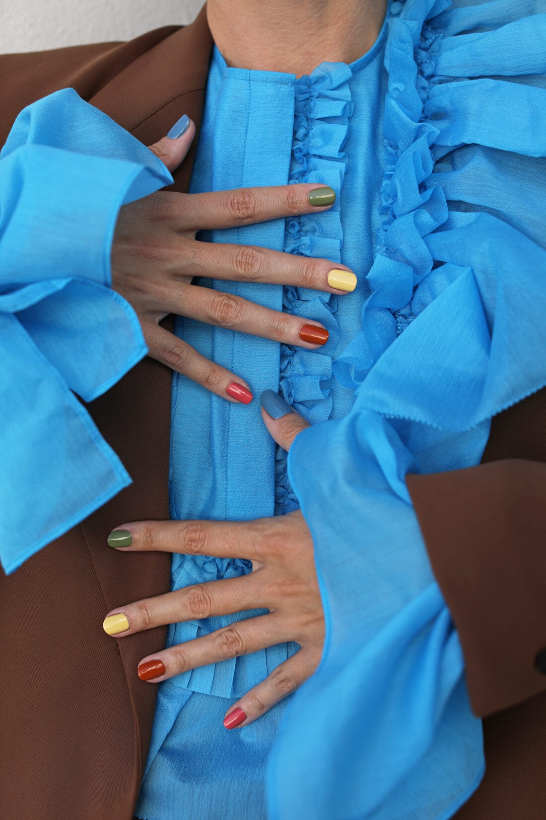 What is the perfect way to add color to any look? A bright polish of course! Essie‘s latest collection ‘Ferris of them all‘ captures the perfect pops of color for fall. I decided to mix and match and create a rainbow on my fingers. Wearing my current favorite Zara suit and one of my all time favorite H&M tops (seen here). You can see the entire Essie collection here!