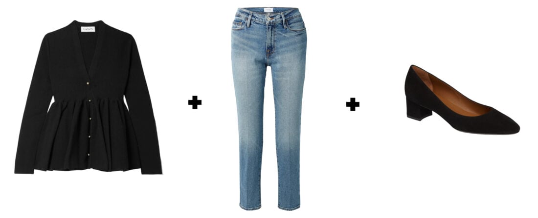 Black Peplum Cardigan // High Rise Straight Leg Jeans // Black Suede Block Heel Pumps