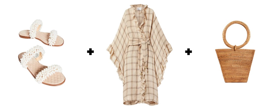 Pearl Sandals // Checked Linen Blend Robe // Rattan Ring Handle Bag