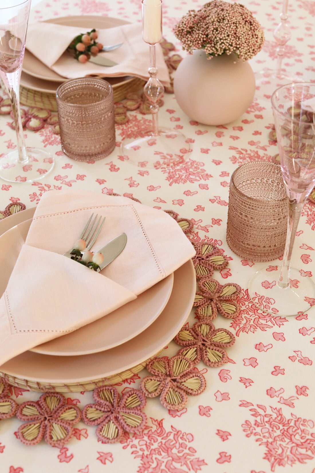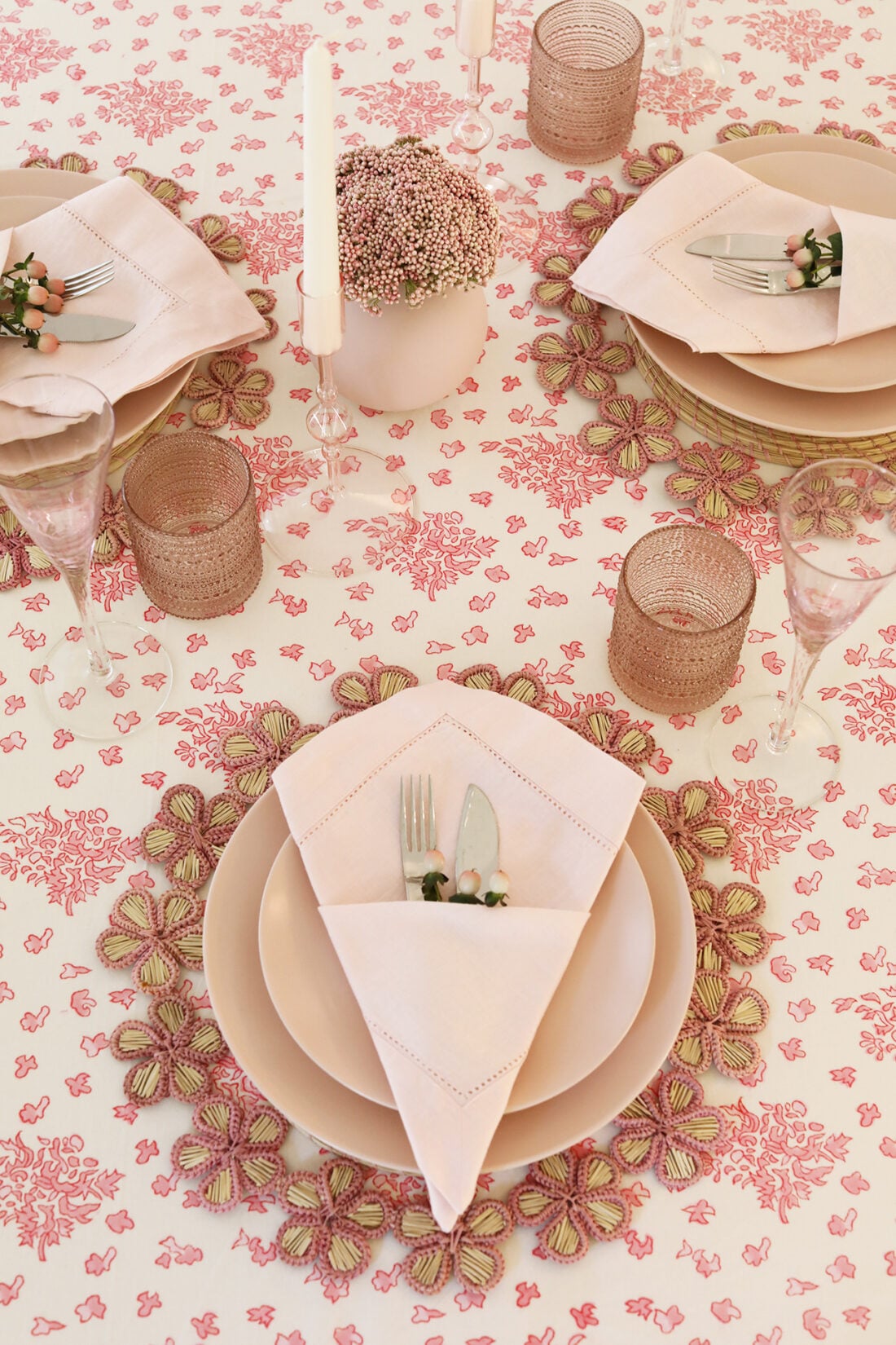 Tablecloth: Julia Amory // Woven Placemat: Etsy // Pales: Year & Day // Napkins: Amazon // Flatwear: Vintage // Cups: Crate & Barrel // Champagne Flutes: Thrift store find. // Glass Blown Candlestick Holders: Gift, similar here.