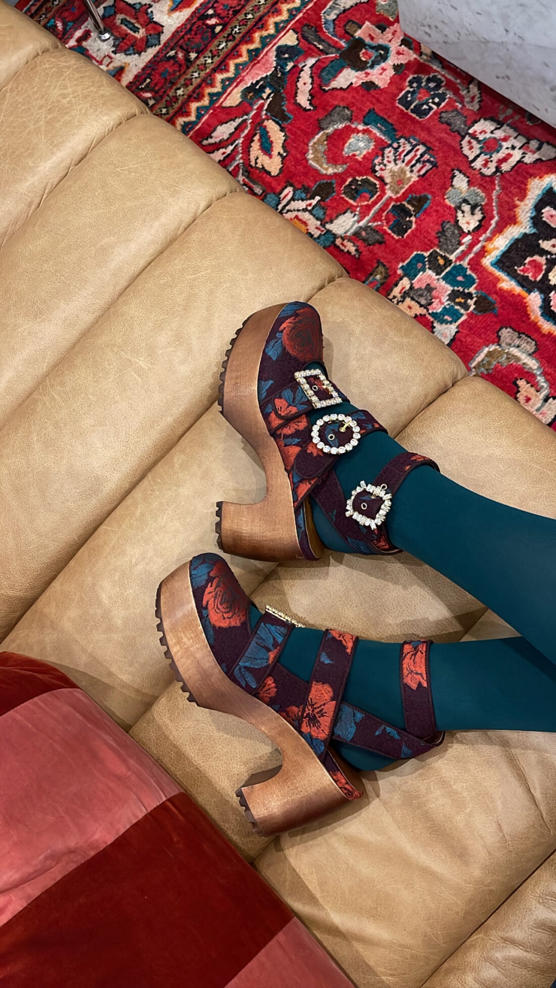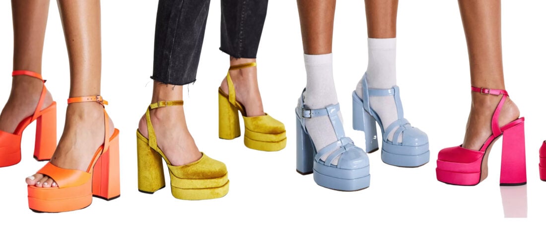 ORANGE PLATFORMS (also in black here) // MUSTARD VELVET SHOES // BABY BLUE MARY JANES // BRIGHT PINK HEELS