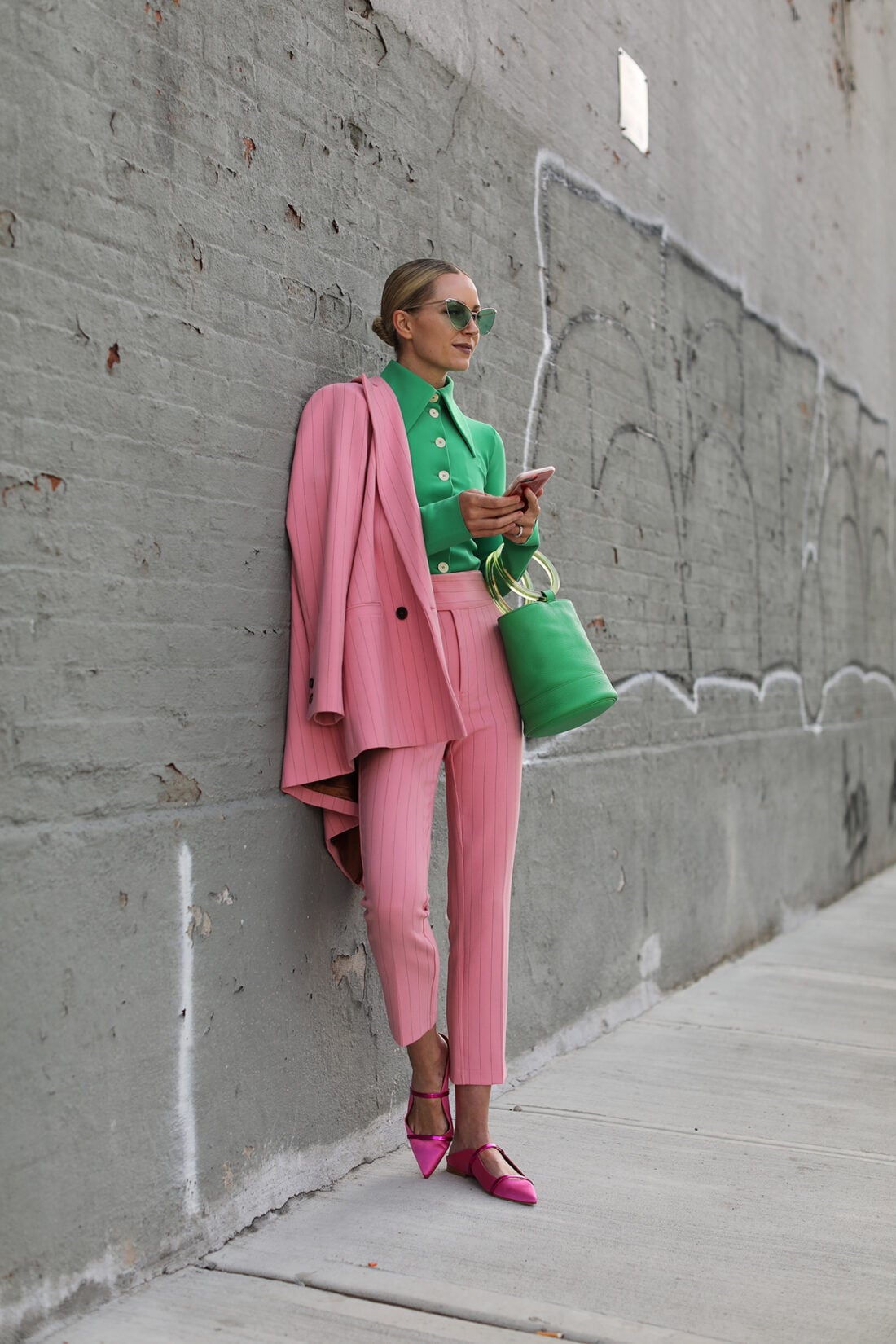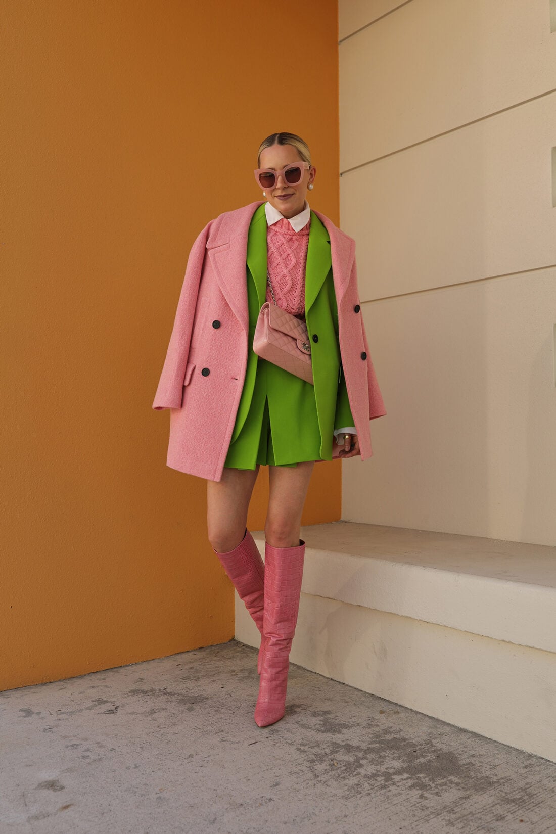 Green and pink is a color combination that can sometimes feel a bit overused. Particularly, kelly green and bright pink outfits have become very popular – seen in floral prints, stripes, and solids. However, I love creating green and pink outfits that are a little more unexpected. My favorite way to do this is by mixing neon green with pastel pink. This green and pink winter outfit and this green and pink resort outfit are two examples. These different shades still create the classic color combination, but with a fun and modern vibe!