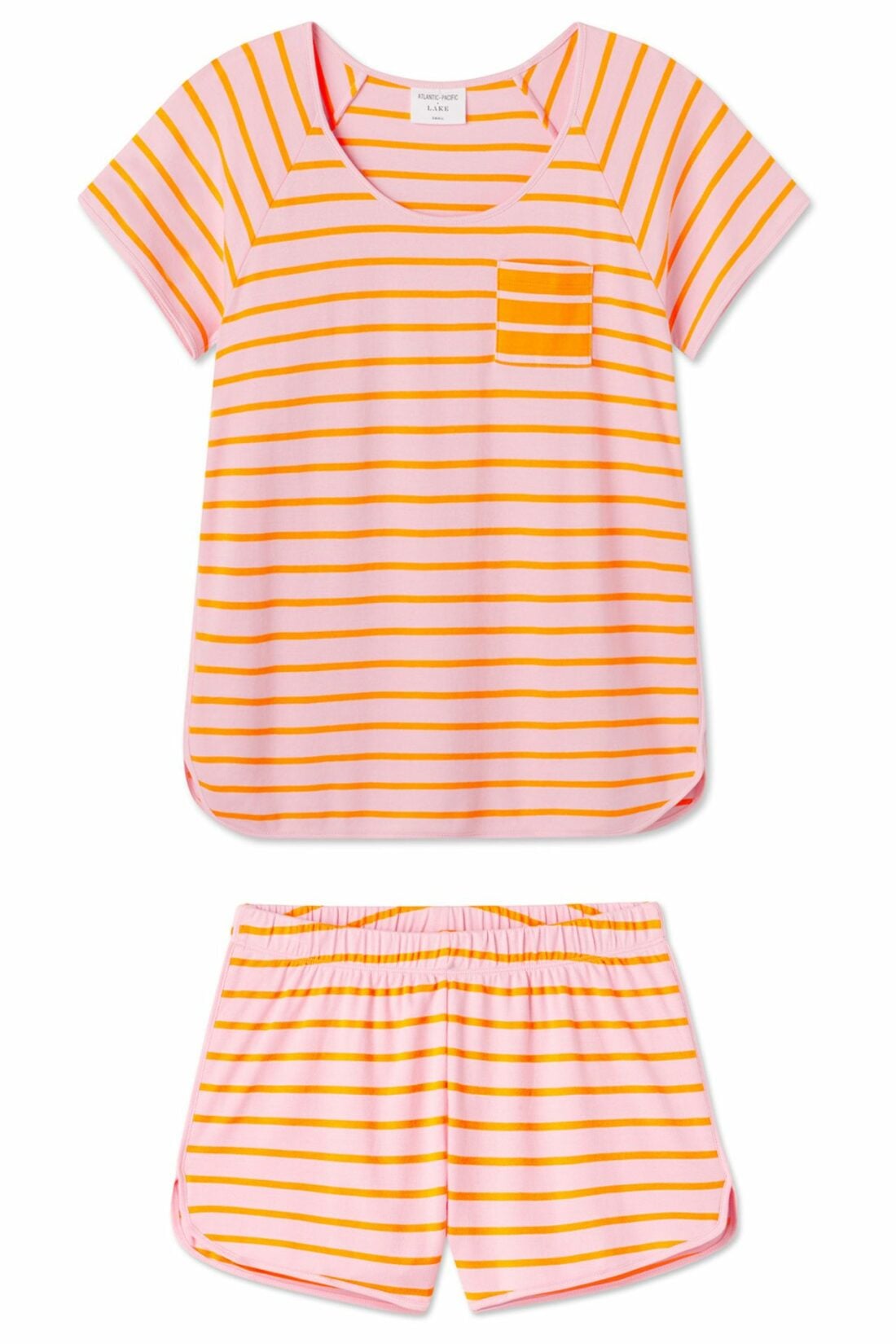 The Pima Avery Shorts Set is available in two stripe layouts, The Pomelo Stripe, a warm pink and orange stripe, and The Maraschino Stripe, a minty green with deep cherry stripe. Both feature a short-sleeve scoop neck top and shorts with an elastic waistband. Similar in fit to the classic Pima Shorts Set from LAKE, this style features a contrast chest pocket, adding a fun twist in bold color. Made from 100% Pima cotton.