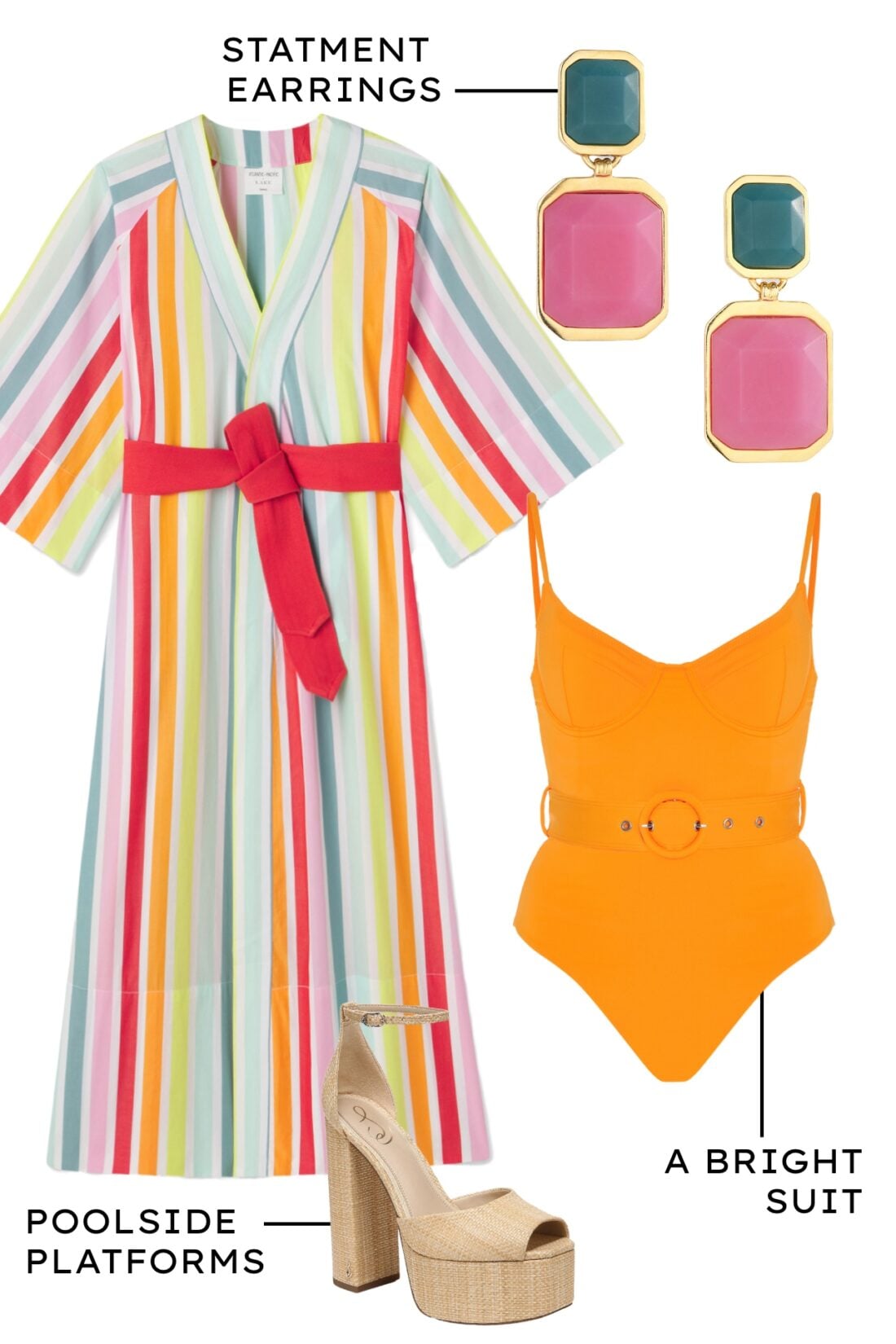 The Bell Robe in Rainbow Stripe // Statement Earrings // Swimsuit // Shoes