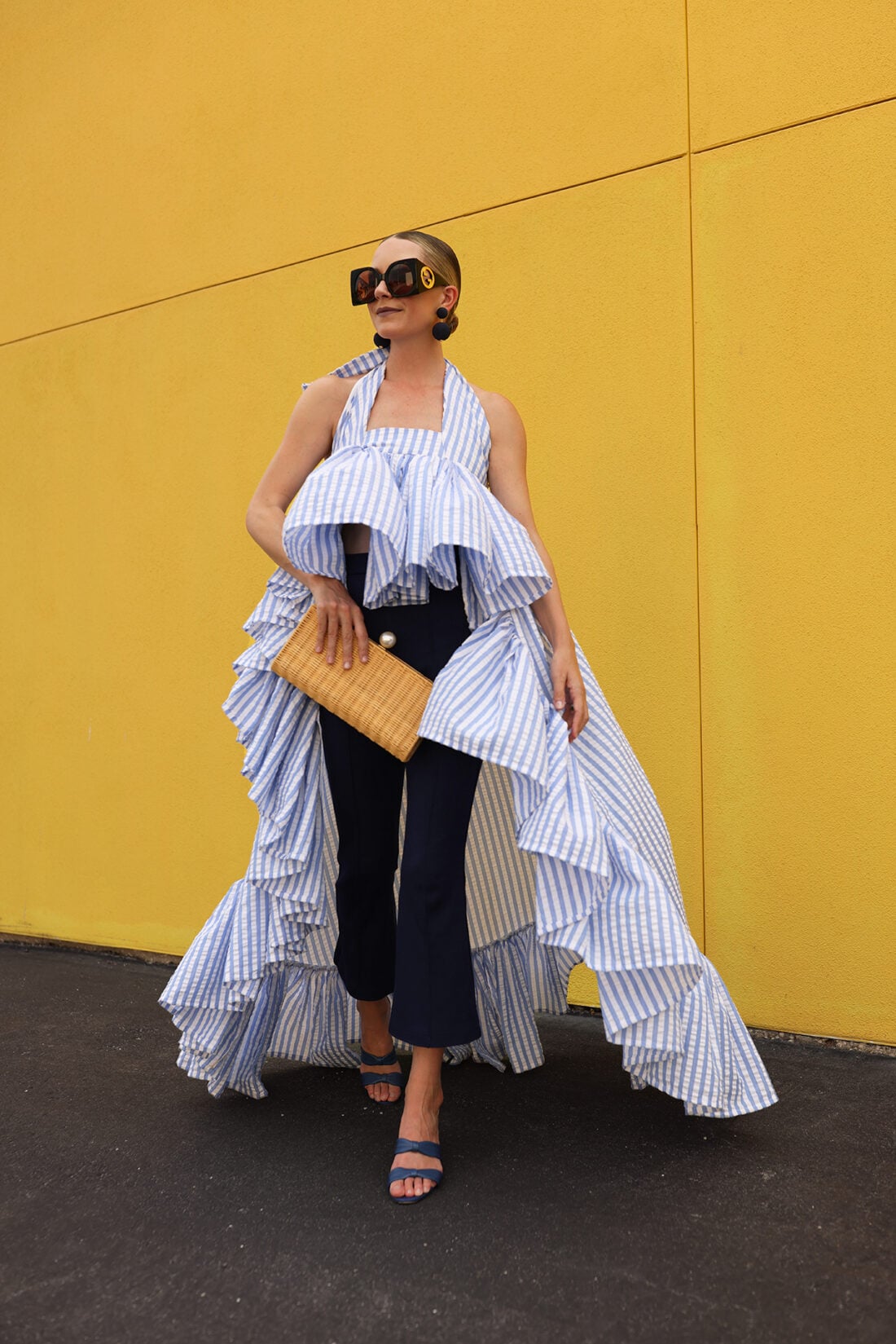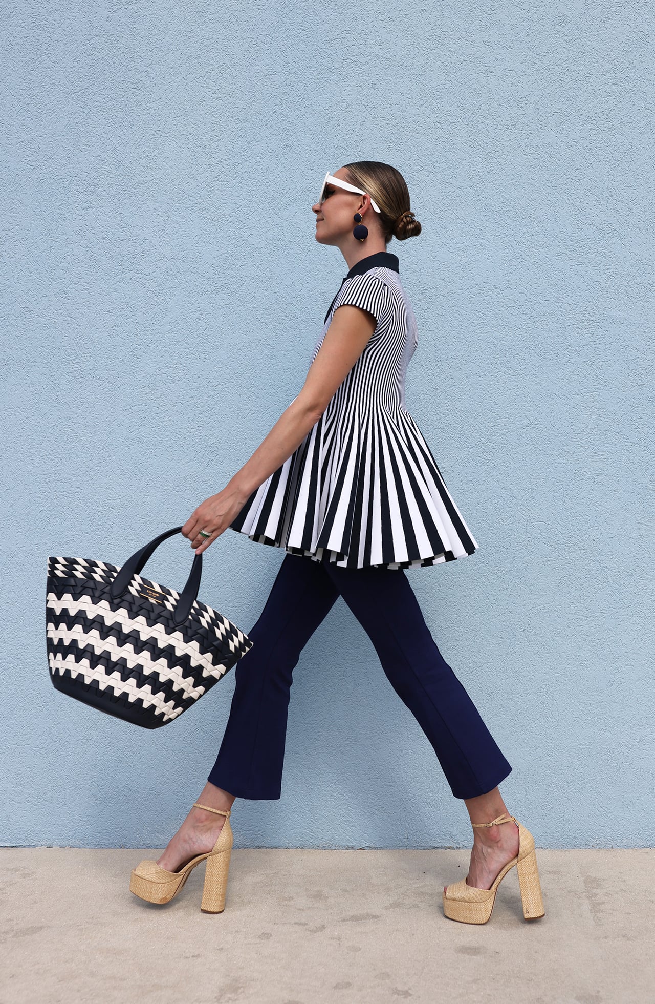 Next up is the Navy Penny Pant! This is such a classic and I will be wearing this pant well into fall with chunky loafers or an ankle boot. Above, I am wearing it with a Loewe top, Kate Spade bag and these platforms. With the next look I am going for FULL DRAMA, wearing it with a House of Sheldonhall top I found on a resale site, Manolo Blahnik shoes, and these sunglasses. I also think the navy pant would look so good back to this floral top for a more femme take or back to this sweater to complete a more classic transitional look.