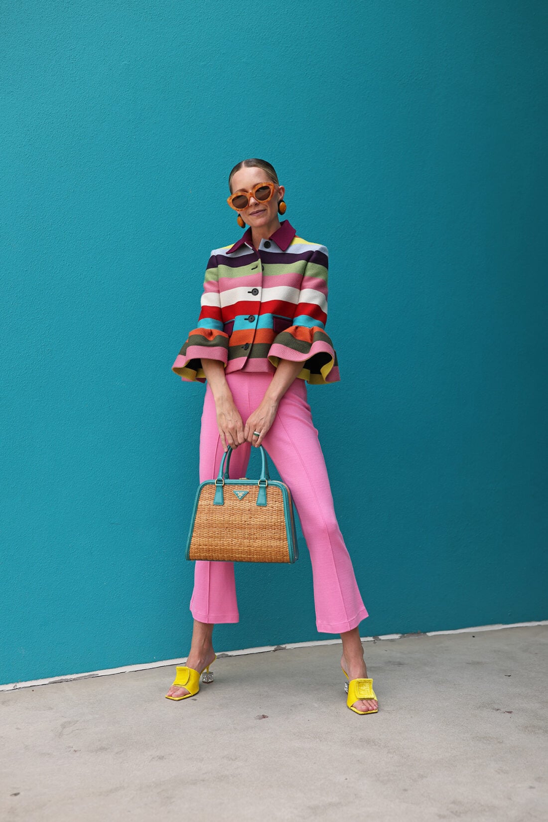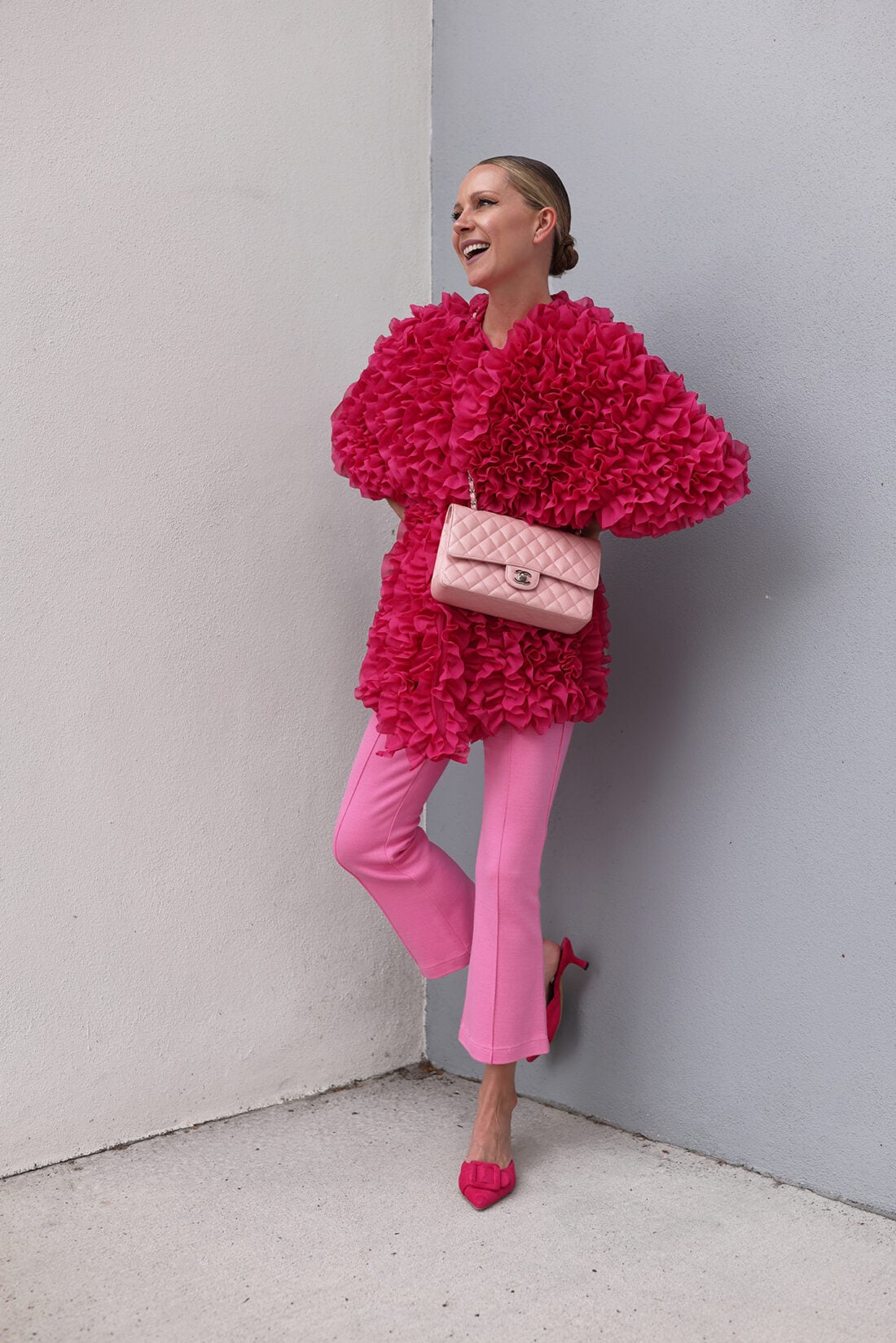 In the first look I am wearing the Peony Pink Penny back to Roger Vivier heels, a second hand Prada bag, an old Mary Katrantzou jacket and these shades. In the second look, I switched it up and paired the pant with this Zara fluffy coat and these mules. The Penny Pant would also look adorable back to this more casual striped top and these sneakers. Honestly, it’s so versatile, you can’t go wrong!