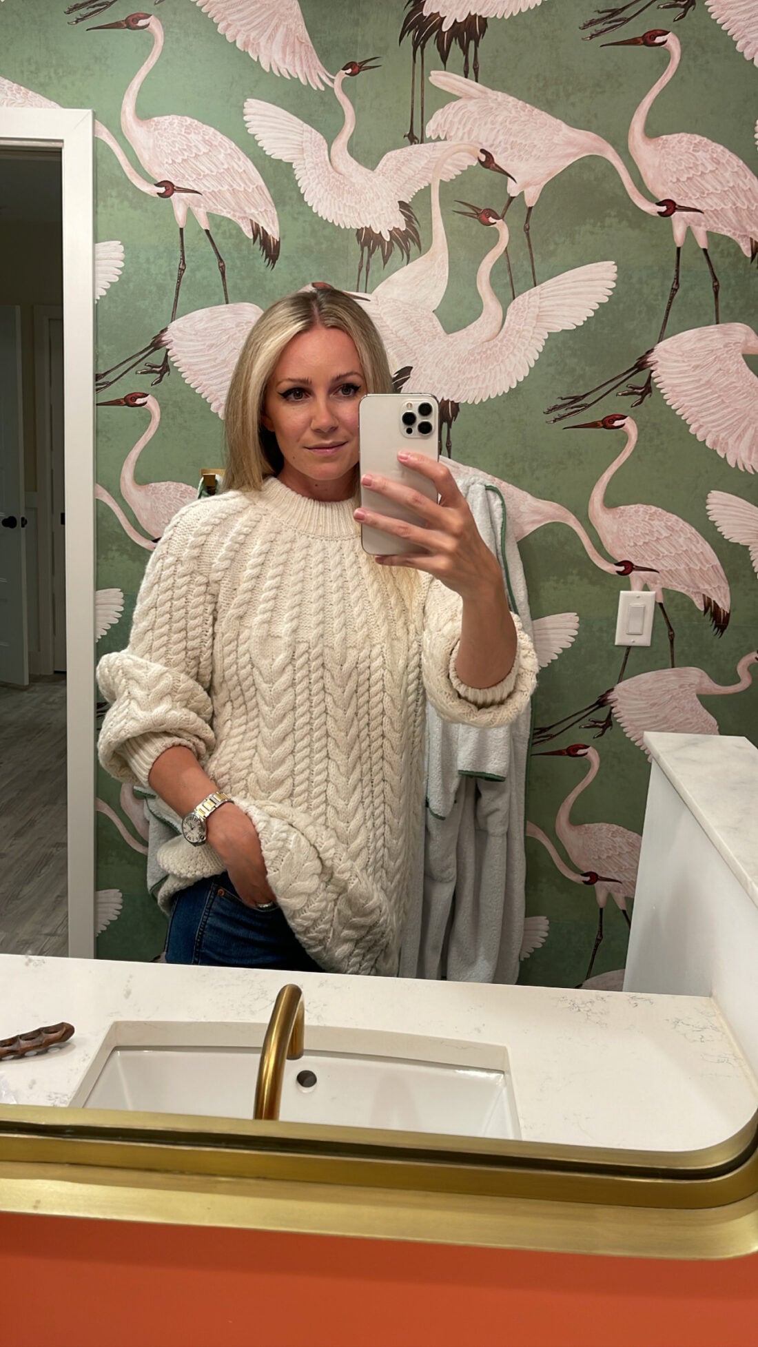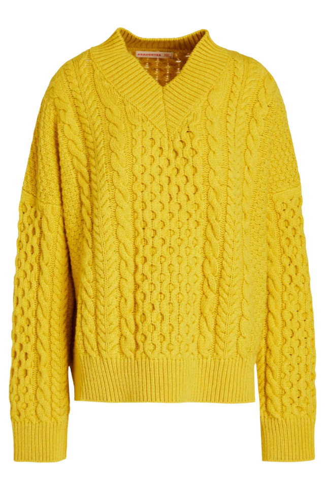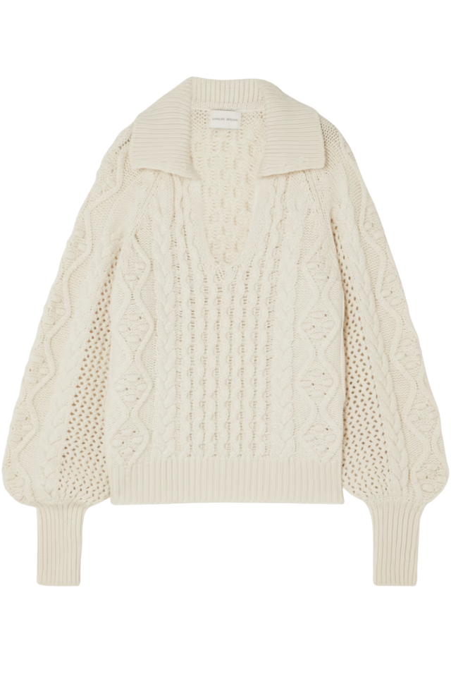 Typically, fisherman’s sweaters are available in classic cream colors or natural colors like a stone or light gray, which makes them so easy to style to nearly any seasonal style. But, if you are looking to switch it up and go for color, there are some fun updated options out there for you to consider. In particular, I’m loving this speckled sunflower knit interpretation that features a chunky rib-knit collar. This oversized cherry red version that holds a hint of cashmere is undeniably a cozy fall investment piece. Or, what about this cotton puff sleeved cropped take that comes in a beautiful orchid purple? Of course, these aren’t your classic fisherman sweaters, but the inspiration is clearly there!