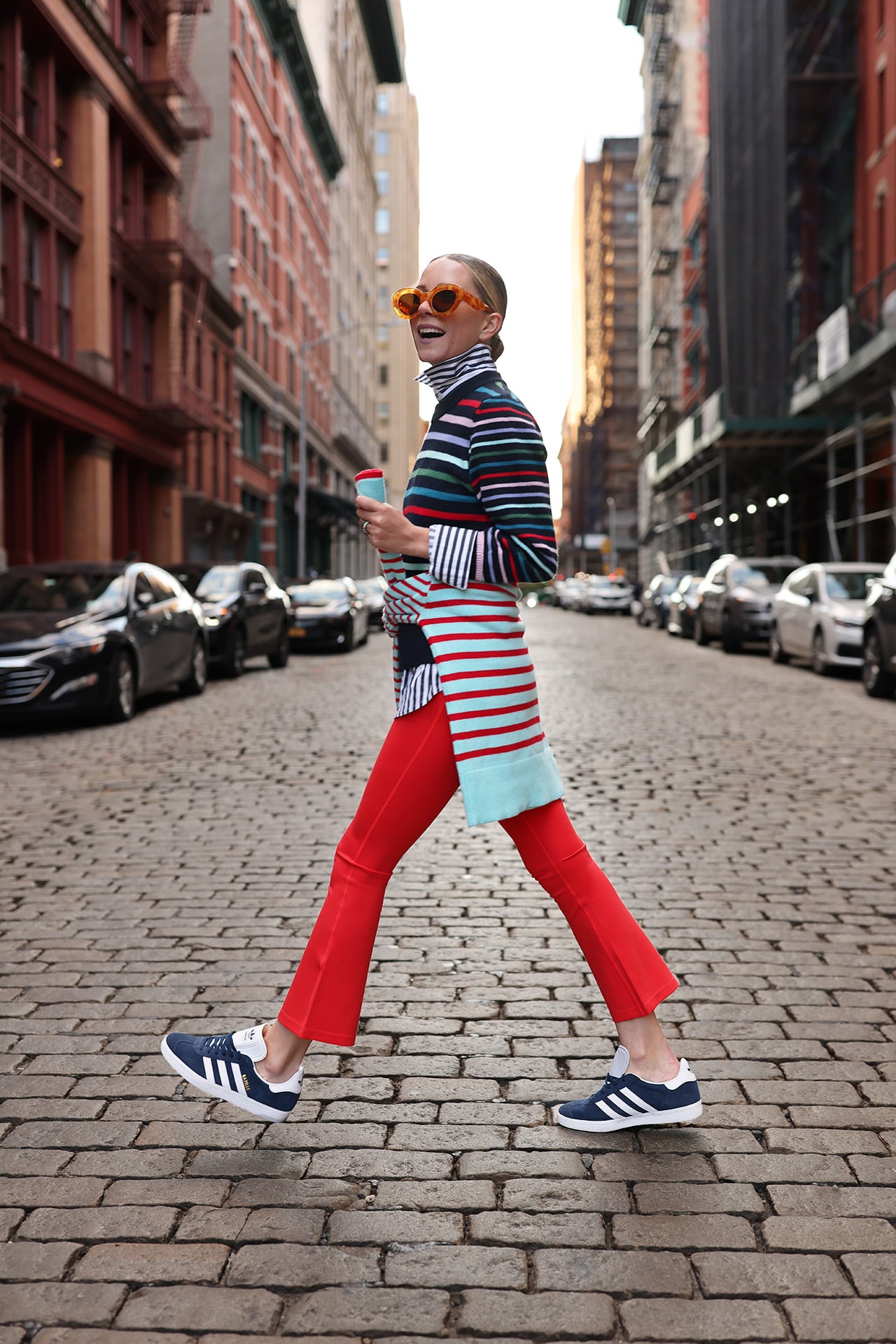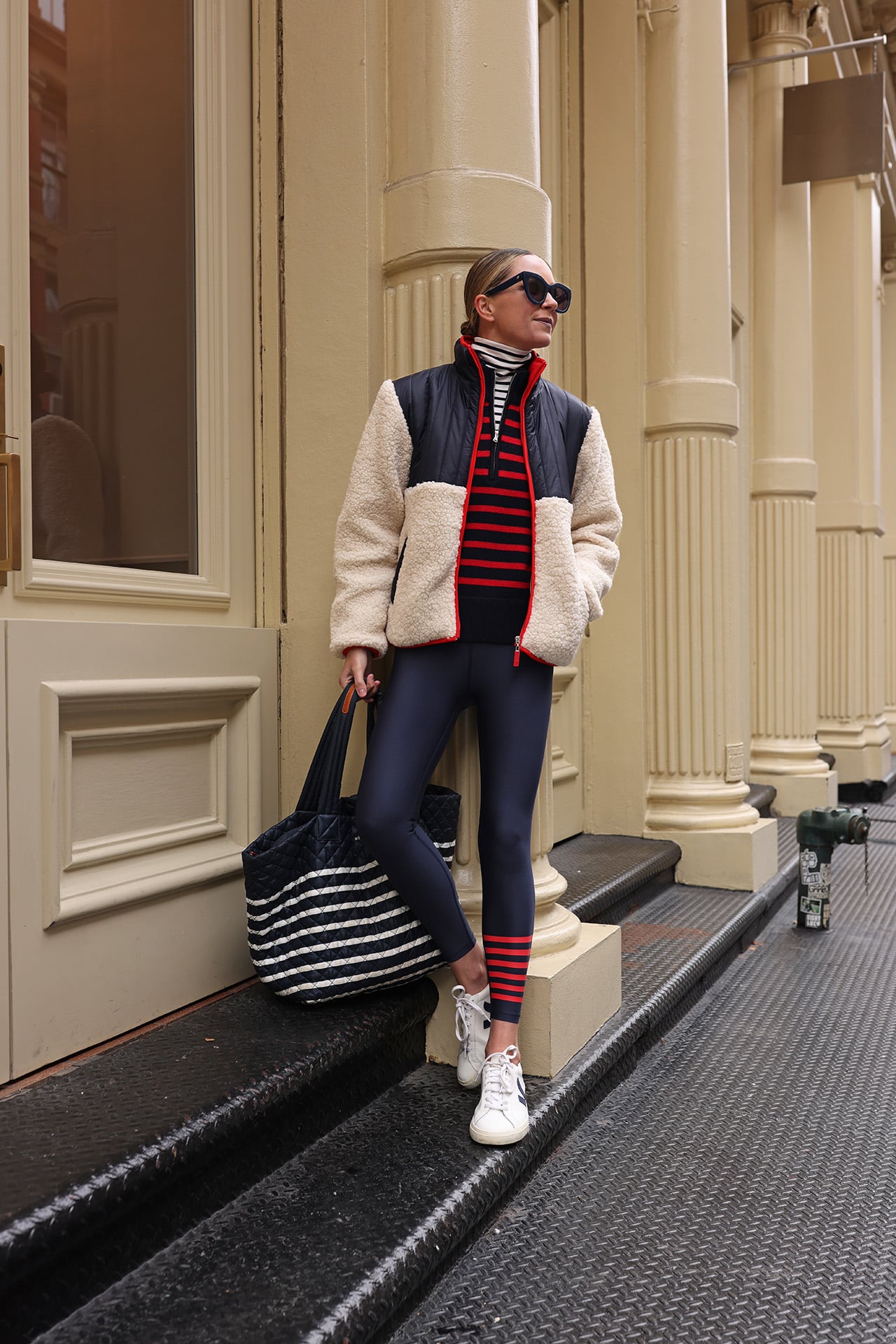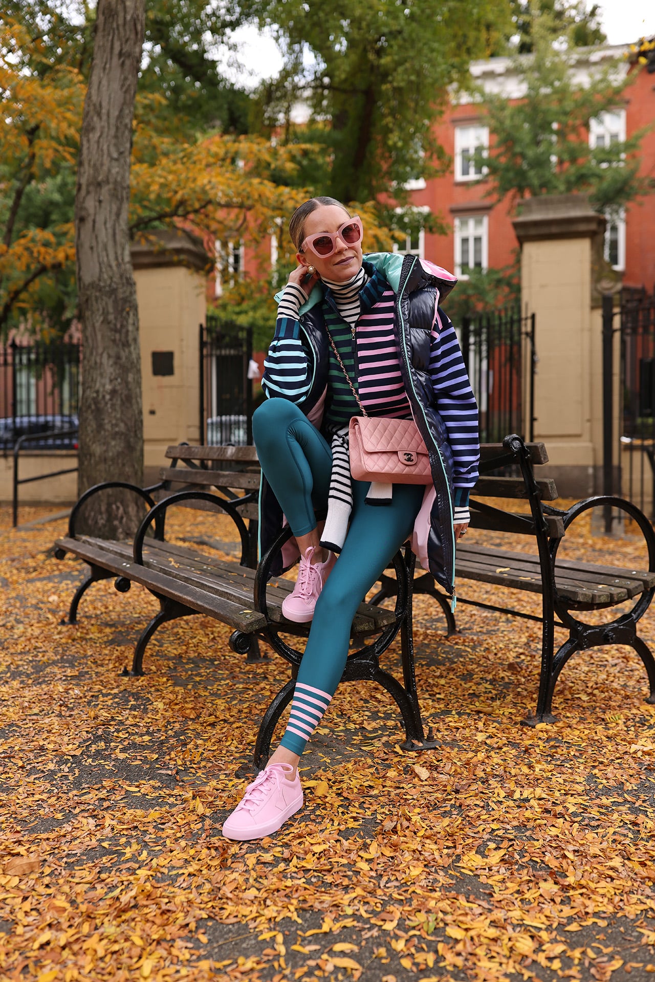 I love a matching moment in activewear looks as much as I do for true editorial moments. When it comes to pattern on pattern, stripes on stripes are simply undefeated. Addison Bay makes it so easy to style and restyle their latest striped pieces! Here I’ve styled the Varsity Multi Stripe Quarter Zip back to these Blue Crush Everyday Leggings and tied it together with the hits of color from this longer-length Everywhere Puffer Vest in Navy. By the way, those striped leggings are available in so many great color combinations – tons of ways to style them!