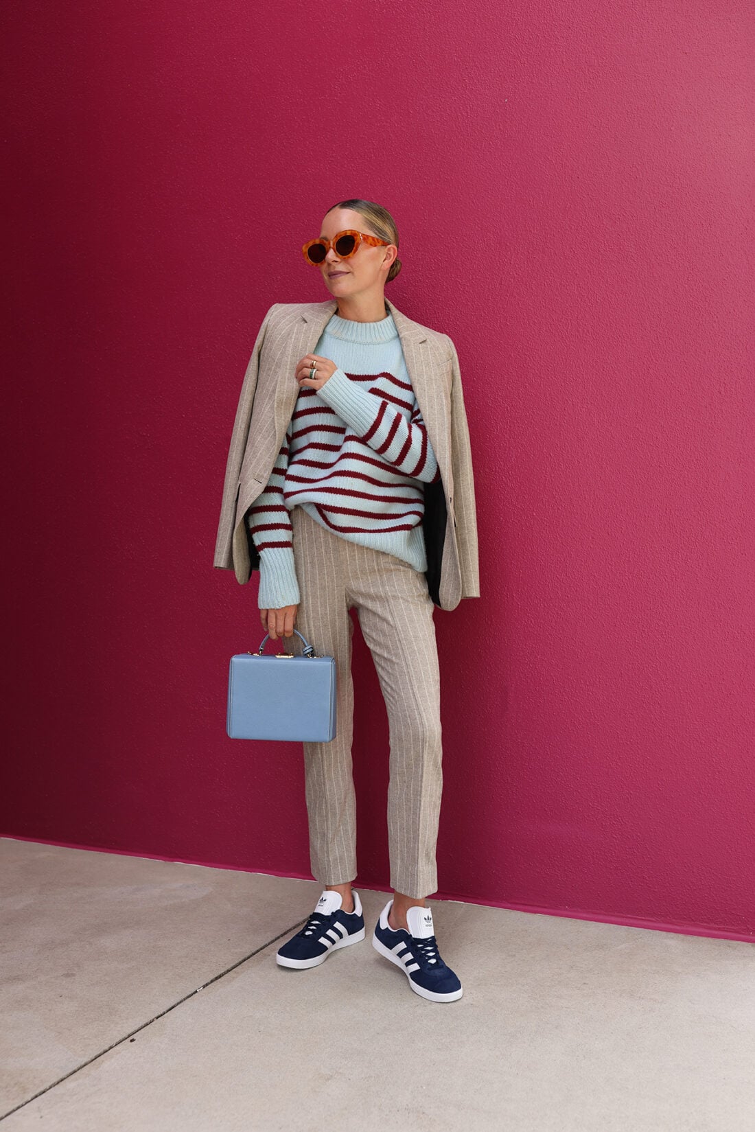 I recently wore my black Adidas Gazelles with one of my favorite pin striped suits and La Ligne sweater (see the outfit here). I love the casual twist that the sneakers brought to an otherwise formal look. It made the outfit feel more relaxed, not to mention, my feet were comfortable all day long.