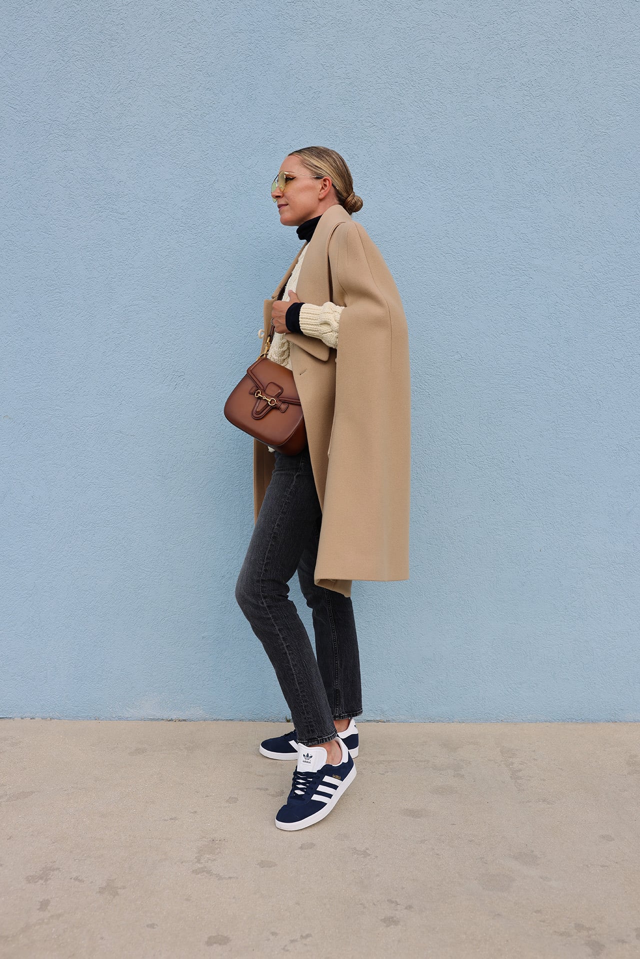 I have recently been wearing this pair of MOTHER denim with these black gazelle shoes and an oversized sweater. I top it all off with this oversized leather tote (a recent obsession) and a simple pair of timeless black shades. And if the temps dip, I just add these crew socks and an oversized coat. This Adidas Gazelle outfit has basically been my January uniform.