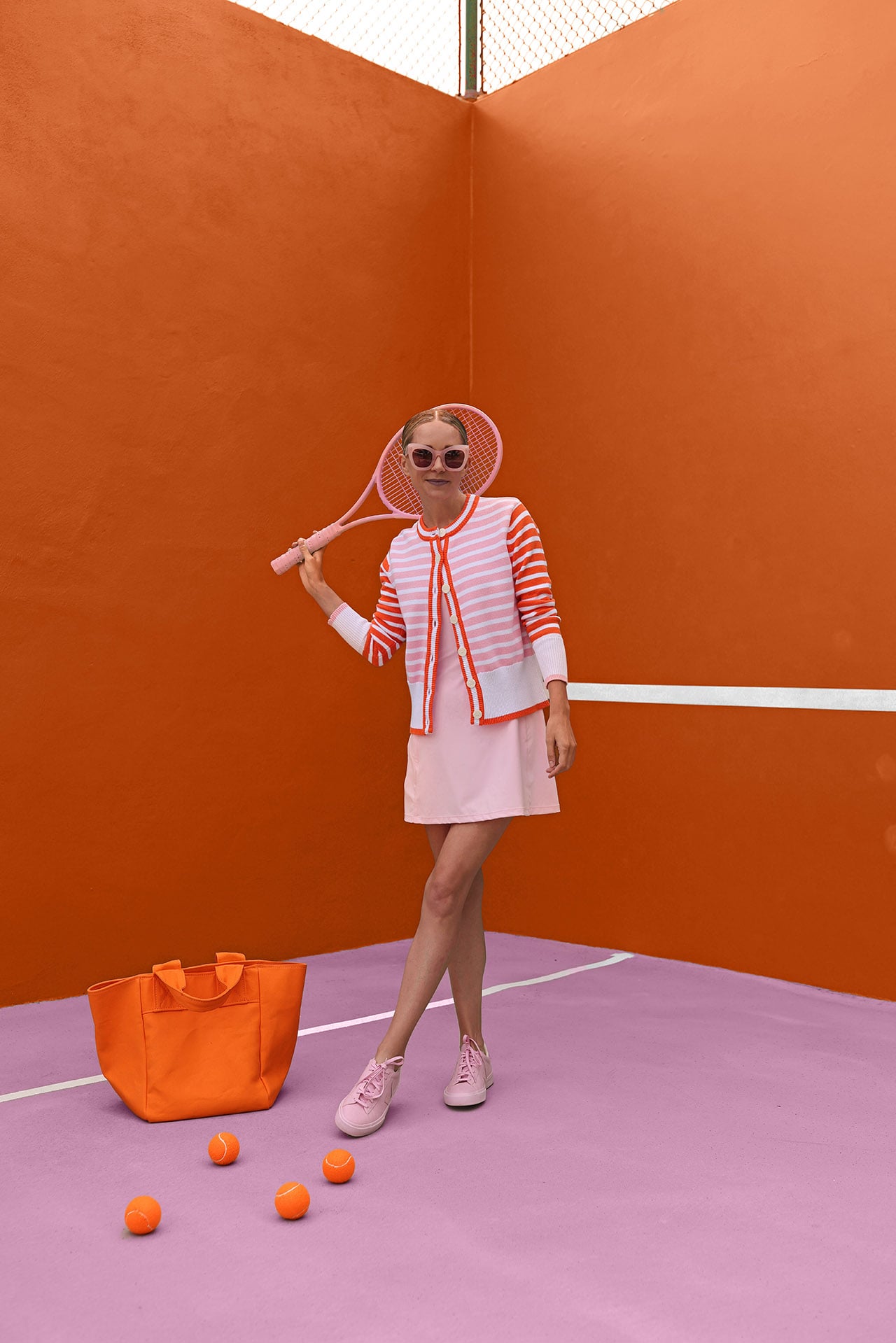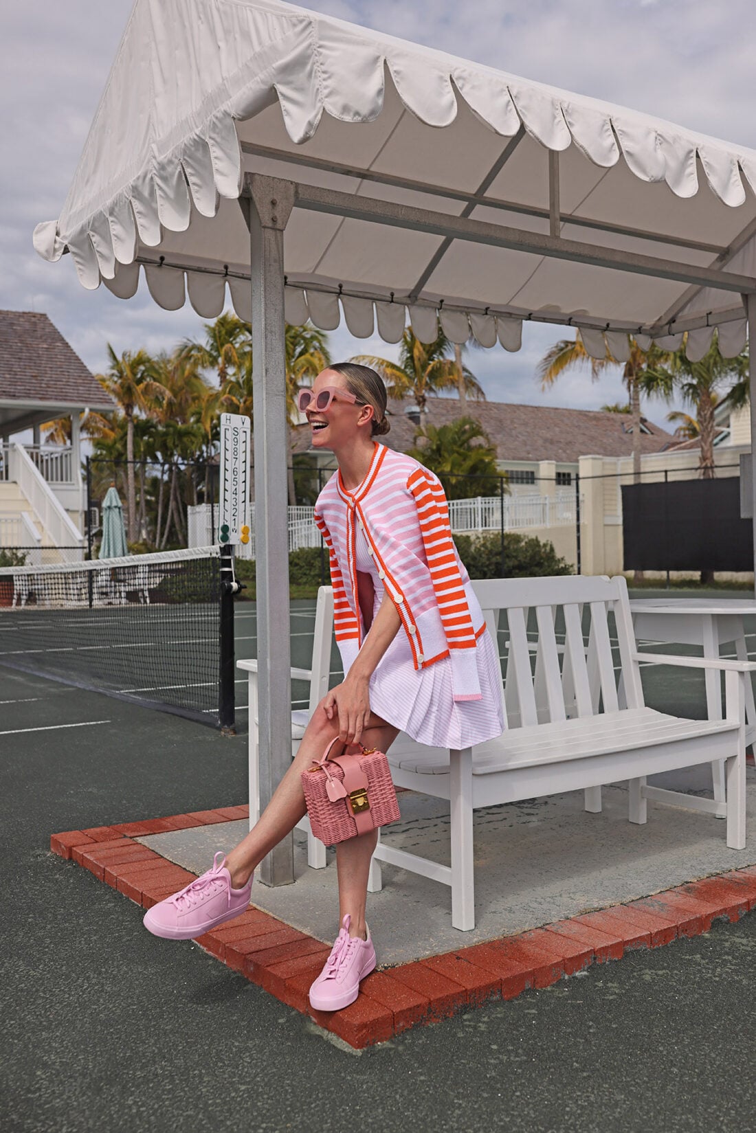 Orange and pink has to be one of my favorite color combos and I lost it when I saw this adorable stripe mix sweater. I wore it here with the Racquet Dress in a pink and white stripe and I also wore it with Panama Dress. The Coastal Cardigan is a great transitional piece during these first few spring weeks. I plan on wearing it on the court but also pairing it back to denim and a simple pair of Chanel flats.