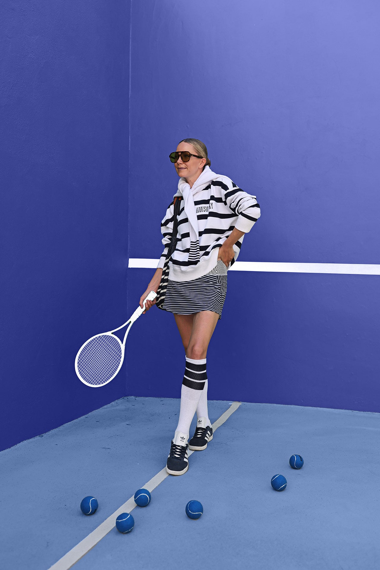 I am back with one of my favorite brands, Addison Bay, to share their newly released spring collection! This drop is brimming with color, stripes, gingham, and even polka dots. I love how easily so many of the pieces can be mixed and matched. The pieces transition easily from on the court to off – a great meeting of style, form, and function! You might remember I shot the fall line in NYC here and so many of the best sellers that I wore then, like their classic legging and stripe mix pull over, are back in brand new colors.