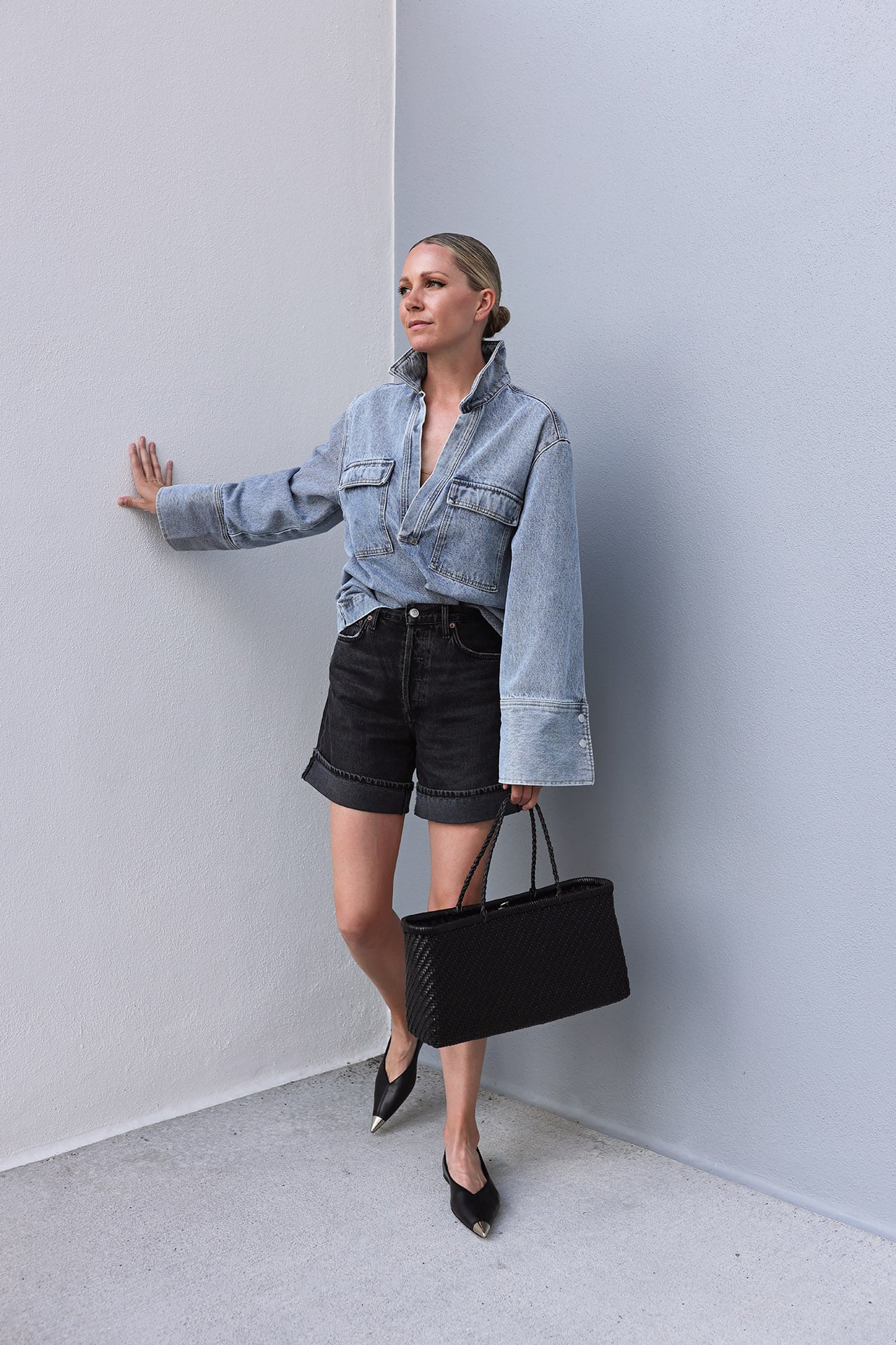 Longer length denim shorts are currently trending, and I am here for it. You may have seen me wearing this dark denim pair on Instagram stories. It’s my current favorite in this category, and I especially love how they look cuffed! They have a high-rise with a button fly opening. They come in this great denim wash, this trendy lighter wash, and this black rinse. I opted for the black, and I love that they can feel a bit dressier than most denim shorts. Recently, I have been wearing them paired with these pointy flats and this oversized denim shirt and this new bag.