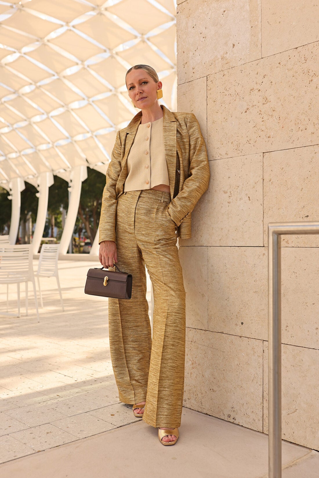 I never knew I needed a gold suit until I saw this one. The fabric is divine and I love the cut. The pants are a great high rise, wide leg that happen to pair perfectly with this cropped button down top. The blazer is elongated and slightly oversized, making it the perfect style to wear back to wide leg pants as well as over a dress. I ended up finishing this look off with these gold sandals that are a perfect height and comfortable enough to wear for hours.