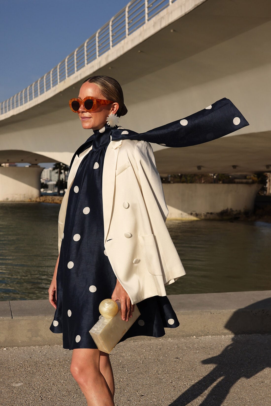 Sézane always delivers great prints in each drop and this collection is no exception. The exploded dot is by far my favorite. I love how this playful print works so well in this elegant mini. If you aren’t a print gal, don’t worry, as this chic mini also comes in a classic black here! I added this elegant blazer, fun statement earrings and these silver shoes.