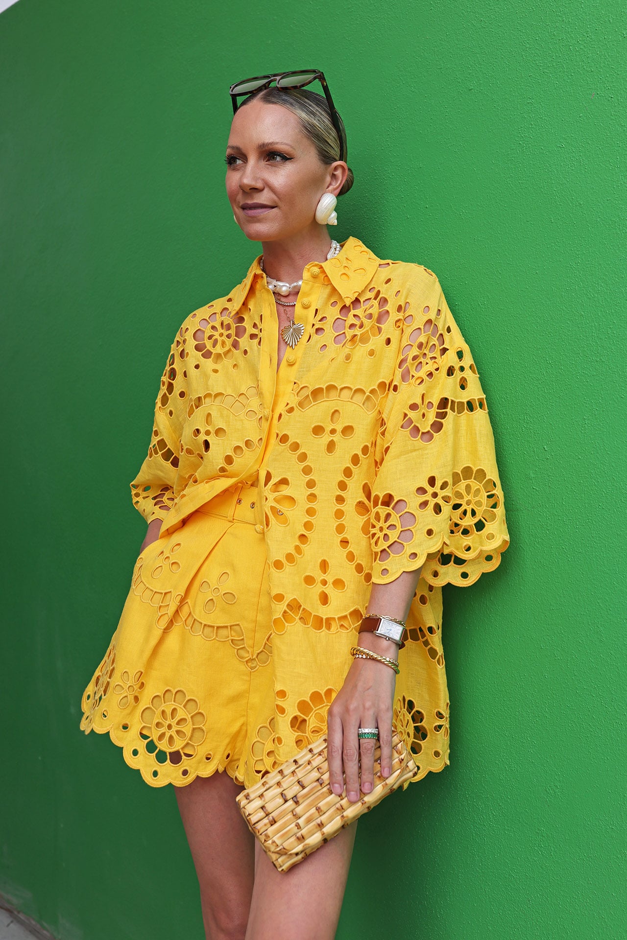 Yellow Outfit 1 // Eyelet Top: Zimmermann // Eyelet Shorts: Zimmermann (yellow set is sold out but love this top and these shorts in blue) // Bag: JMC // Shoes: CH Carolina Herrera // Earrings: Julietta