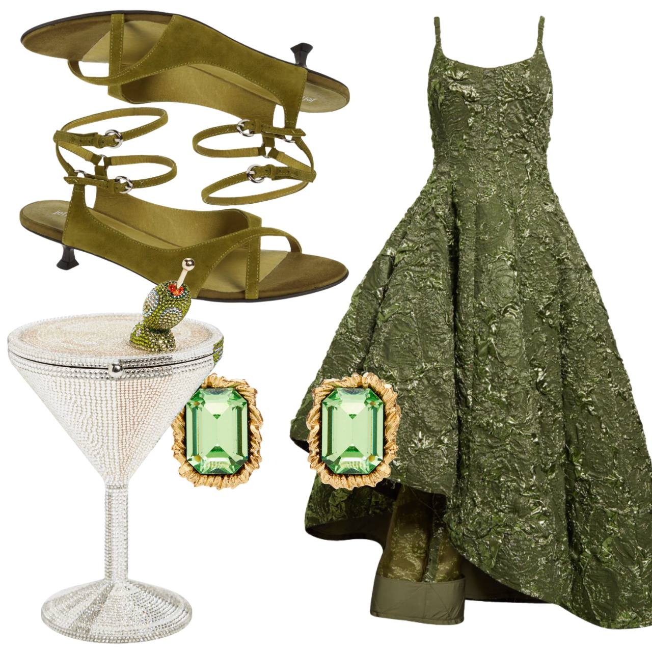 Kitten Heel Strappy Sandals // Jacquard Dress // Crystal Button Earrings // Martini Minaudière