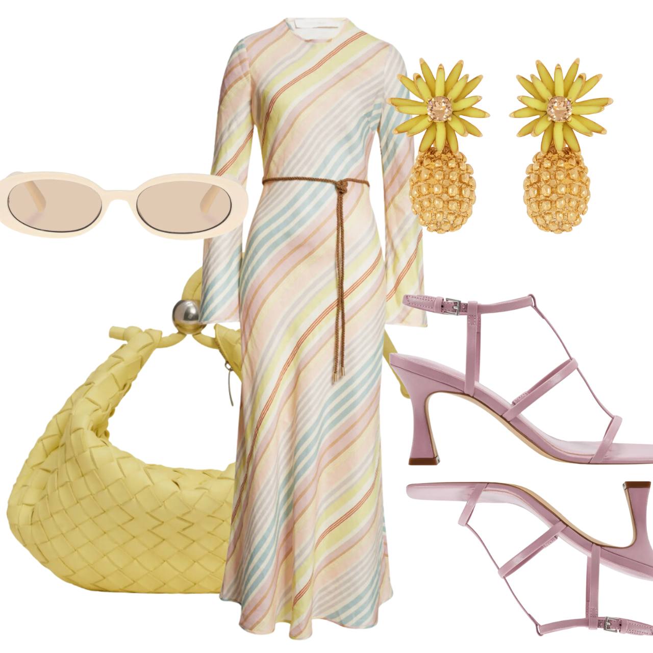 Oval Sunglasses // Stripe Linen Maxi // Cactus Drop Earrings // Ankle Strap Sandals // Woven Bag