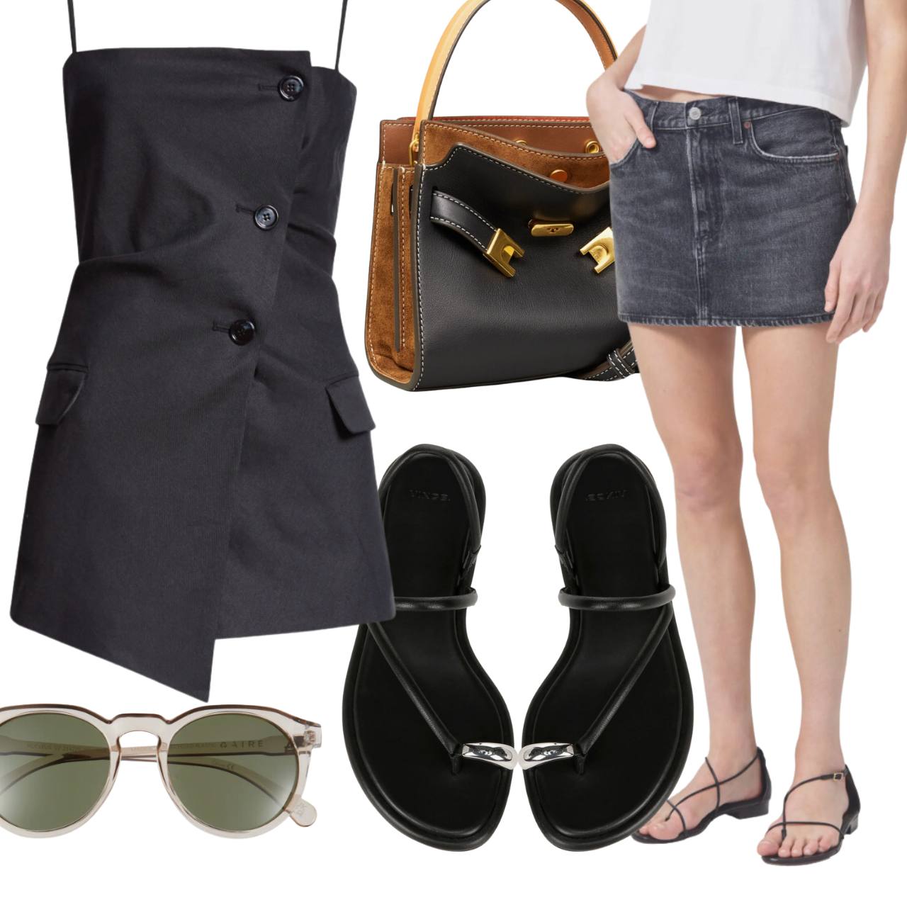 Suiting Top // Leather Bag // Denim Miniskirt // Toe Ring Sandals // Round Sunglasses
