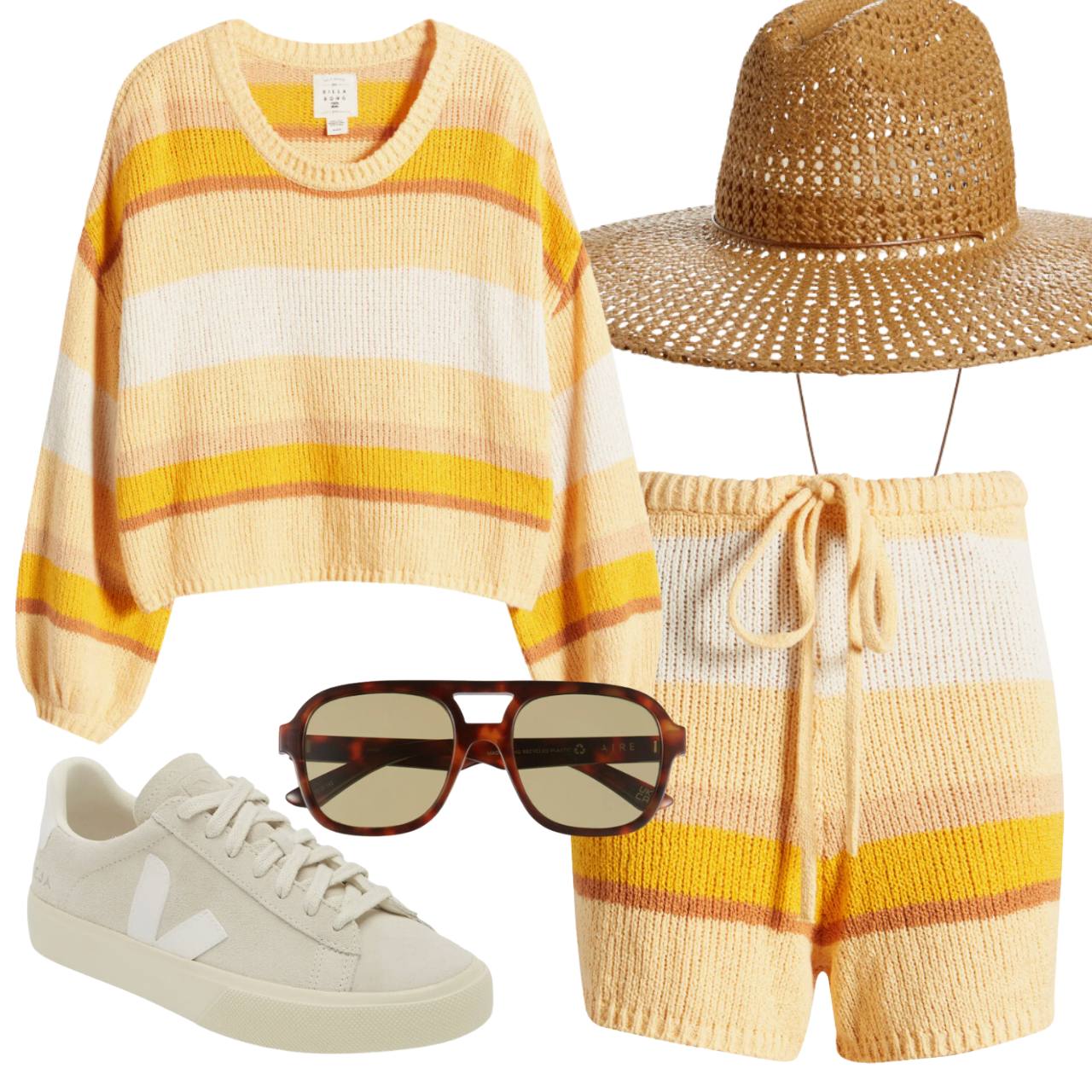 Stripe Sweater // Straw Hat // Stripe Shorts // Aviator Sunglasses // White Sneakers