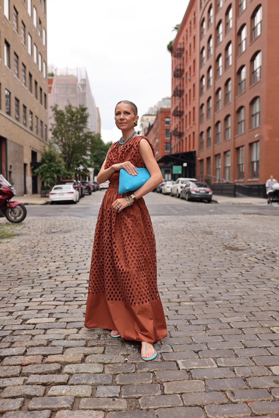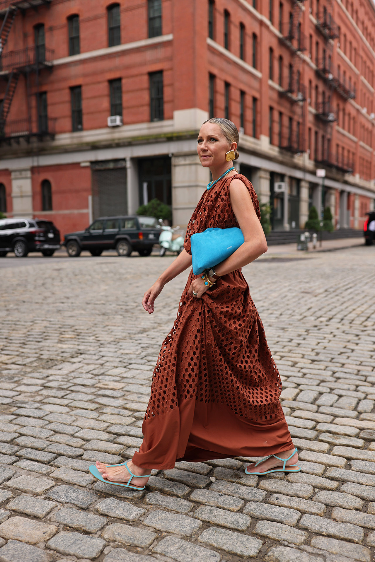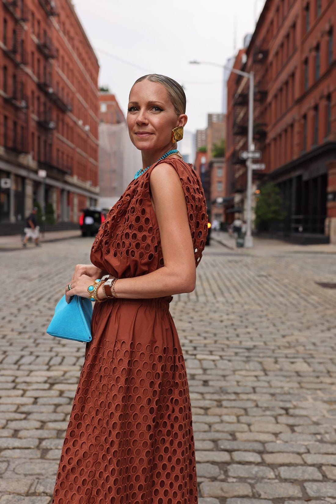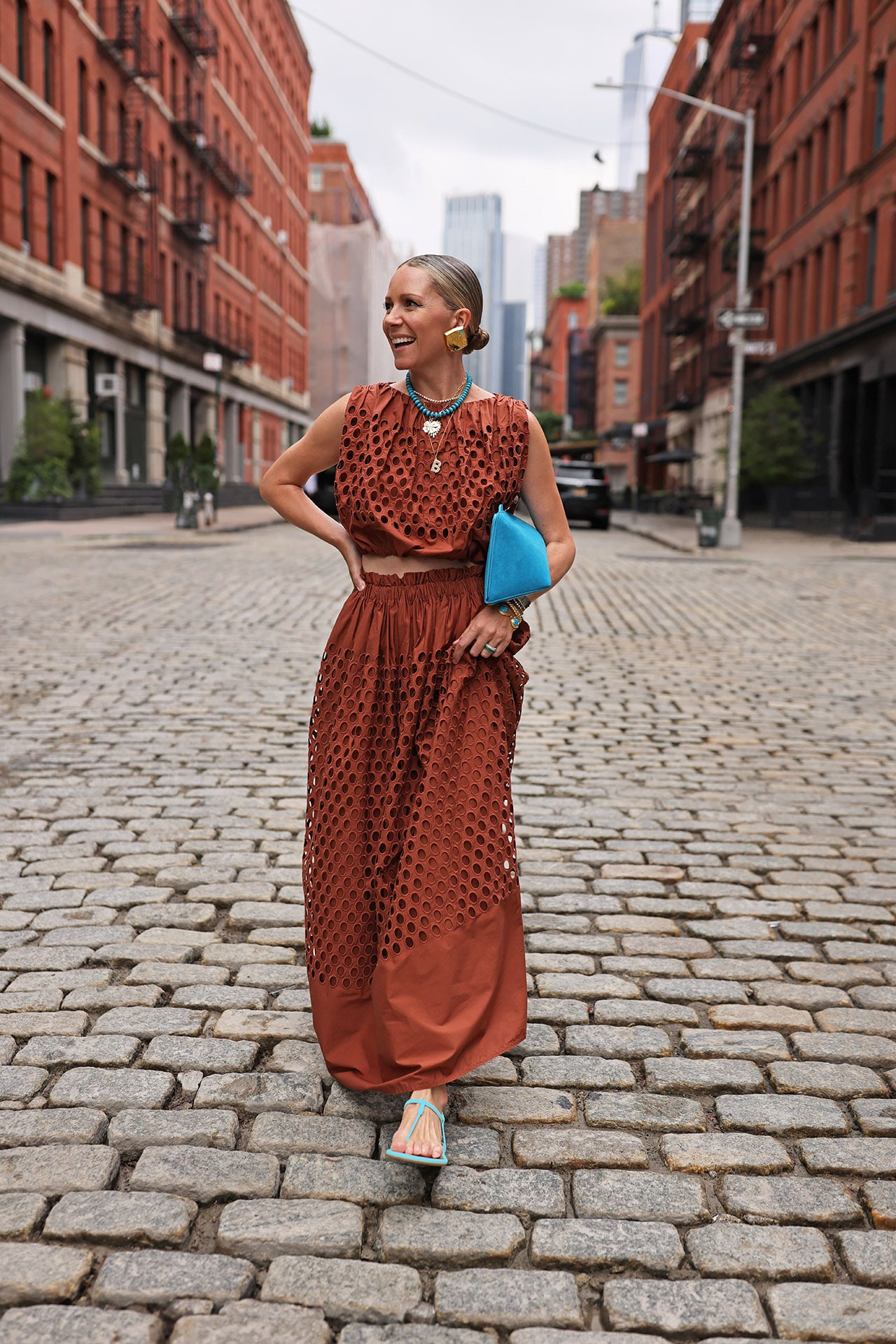 Hello from NYC! It feels so great to be back in the city. I first saw this set when it first dropped on Saks.com and I knew I needed it in my closet. It pairs amazingly well back to anything raffia (like these platforms) and a POP of color. This week I decided to mix it up and pair it with these sandals and this bag for an anything-but-boring brown and turquoise combo.