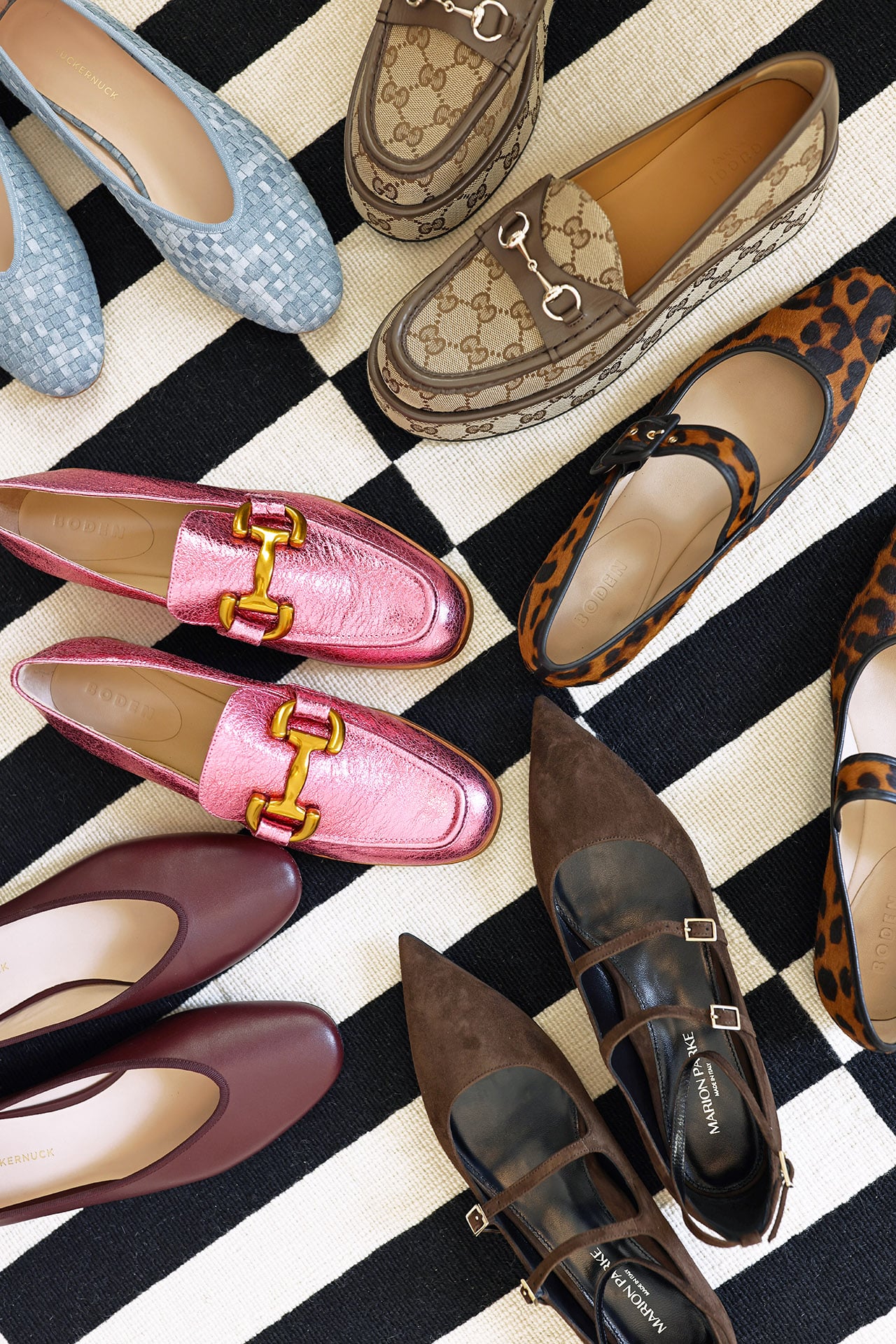BLUE WOVEN FLATS // GUCCI LOAFERS // LEOPARD MARY JANES // METALLIC PINK LOAFERS // OXBLOOD LEATHER FLATS // BROWN SUEDE BUCKLE FLATS