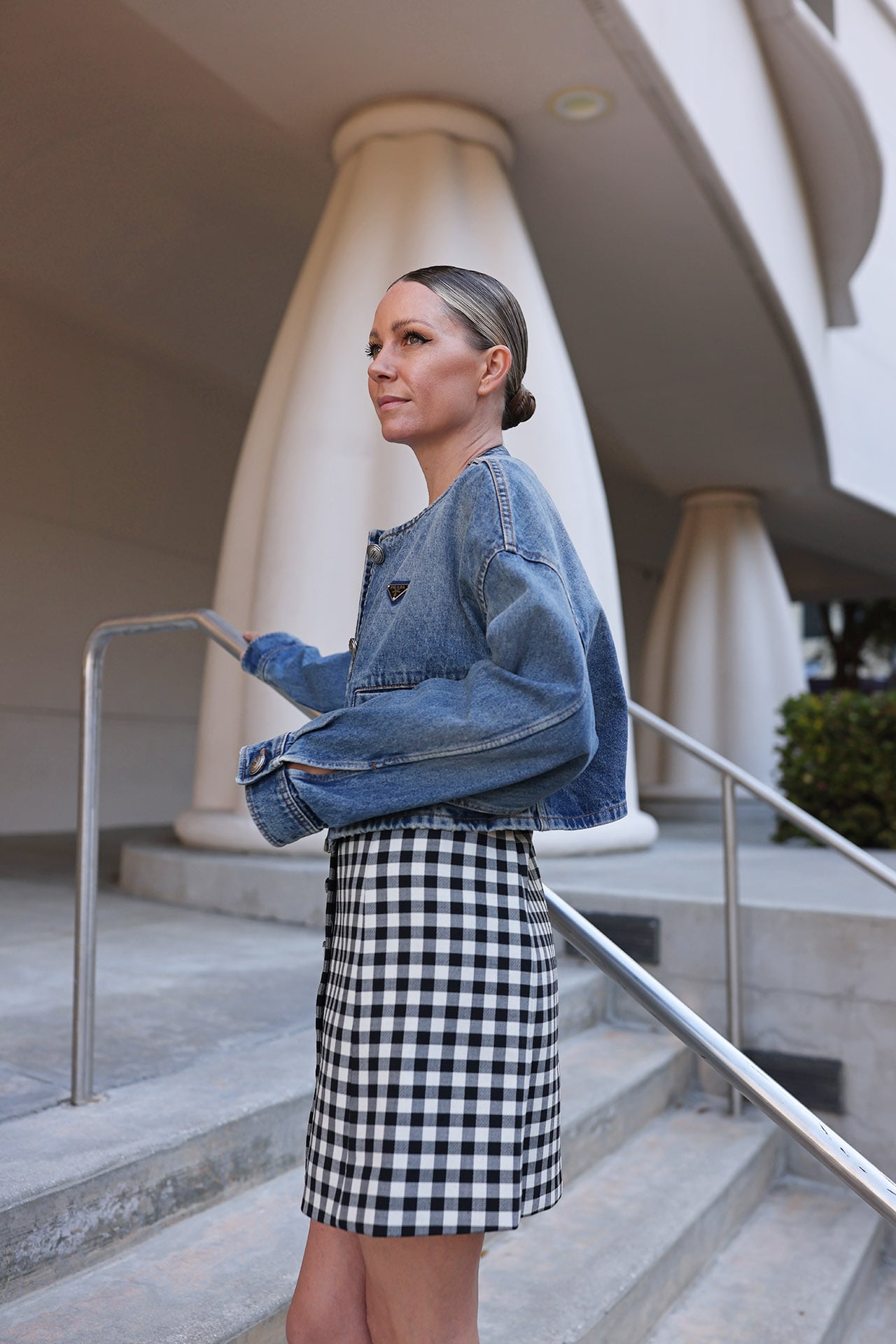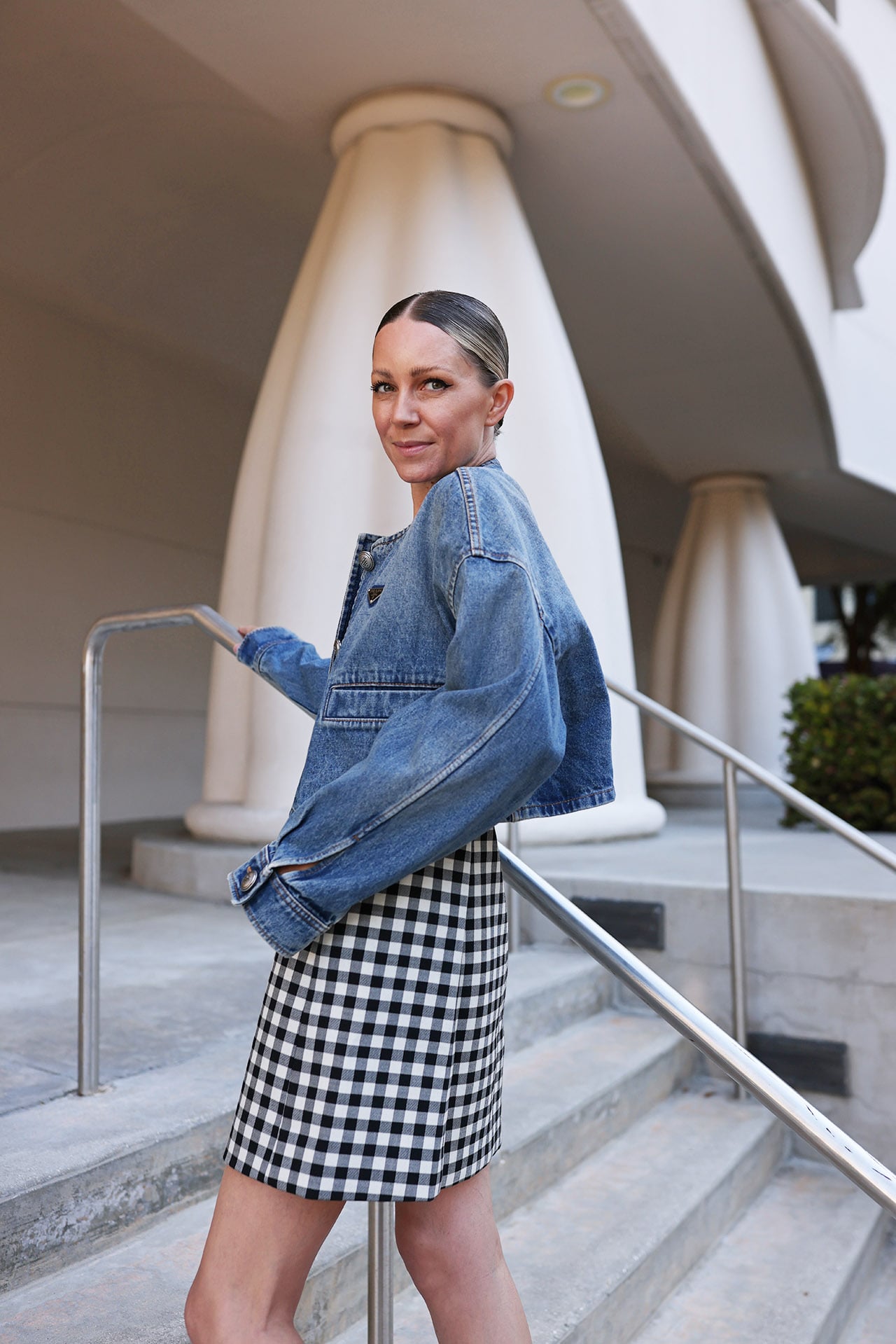 Dress: Rebecca Taylor // Denim Cropped Jacket: Prada // Shoes: Michael Kors