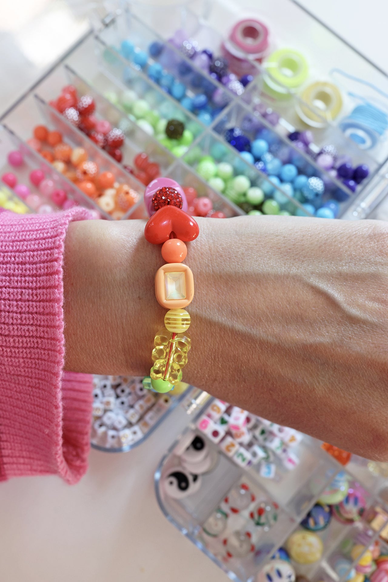 We made bracelets and bag charms for ourselves but also did a little exchange, designing bracelets for each other. Scroll below to see how some of mine came out and the bags that I am pairing with my newest little creations.