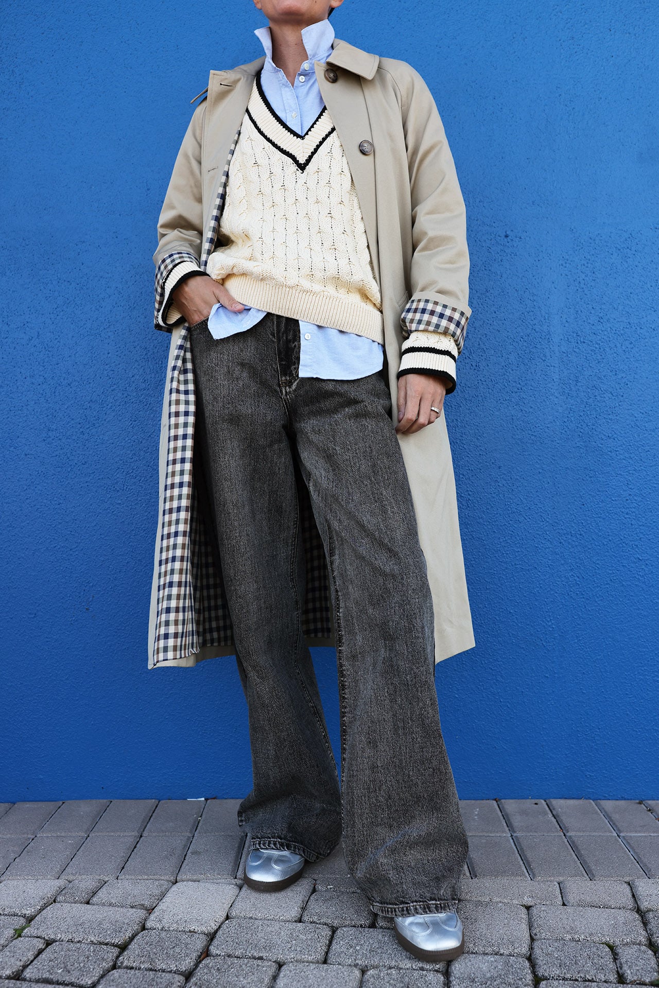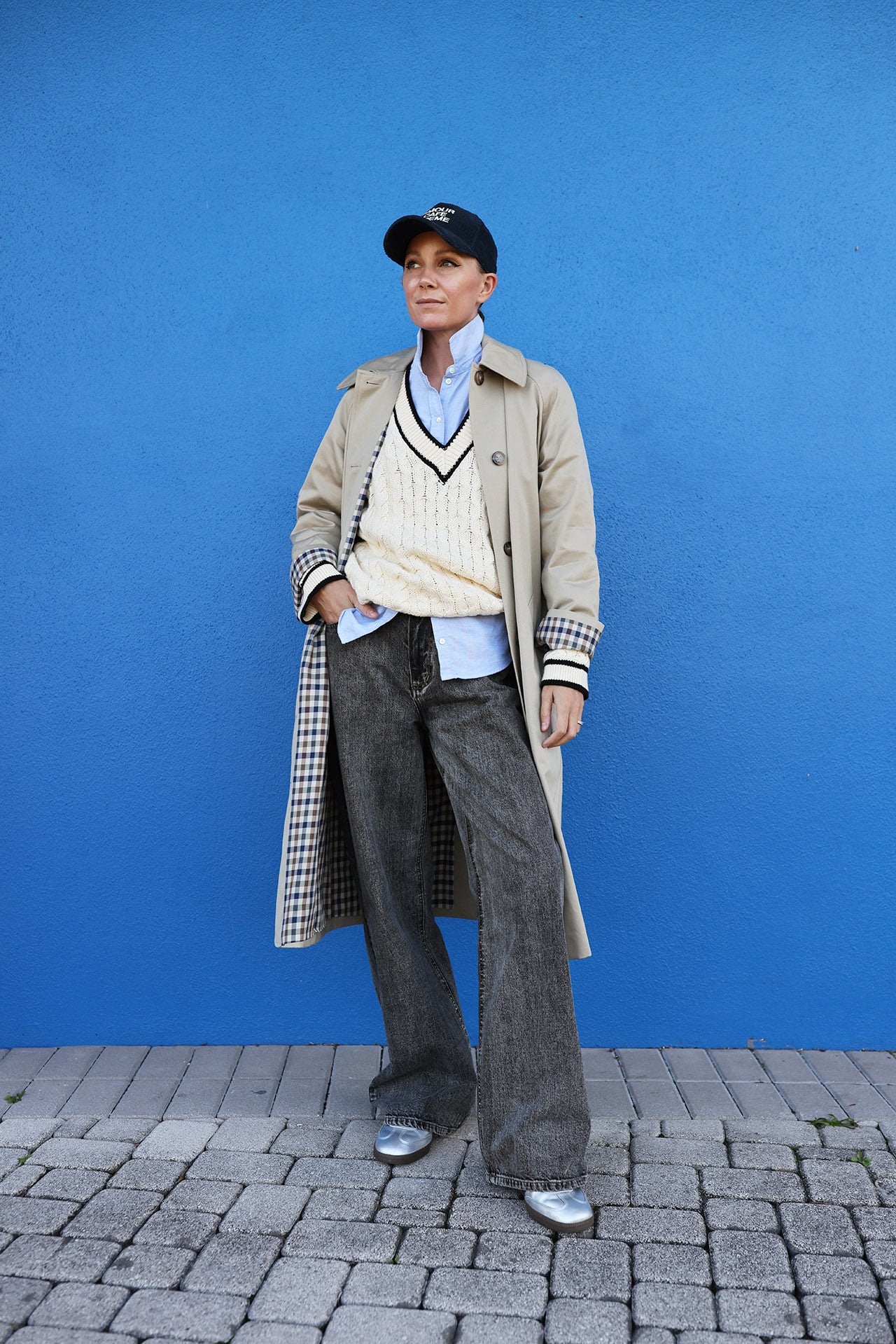 My suggestion for achieving this aesthetic is to pair low-rise jeans with Adidas sneakers, a classic button-down, a cable-knit V-neck sweater, and a modern trench coat. Top off the look with a classic baseball hat. This would be the ultimate off-duty NYC outfit!