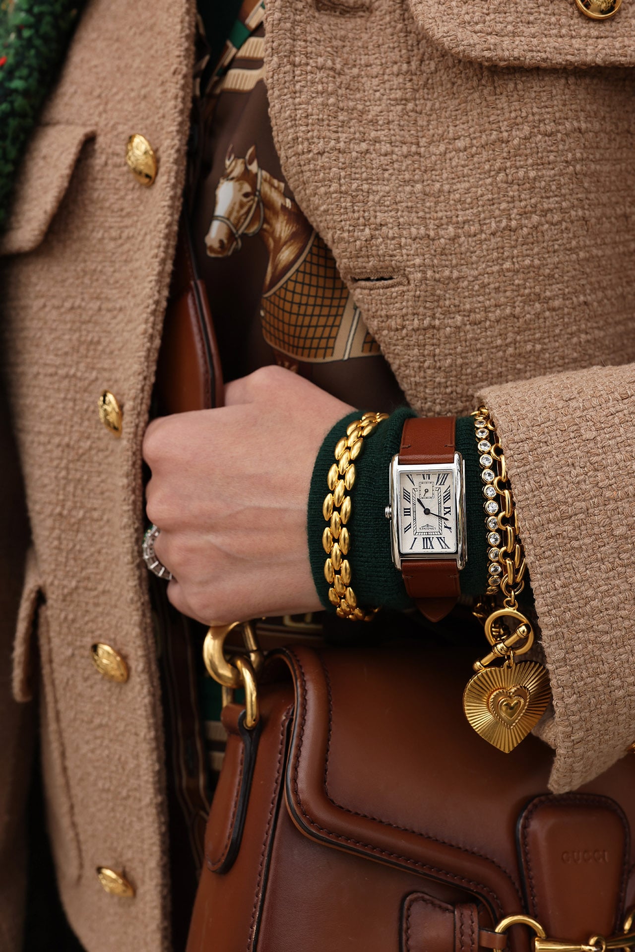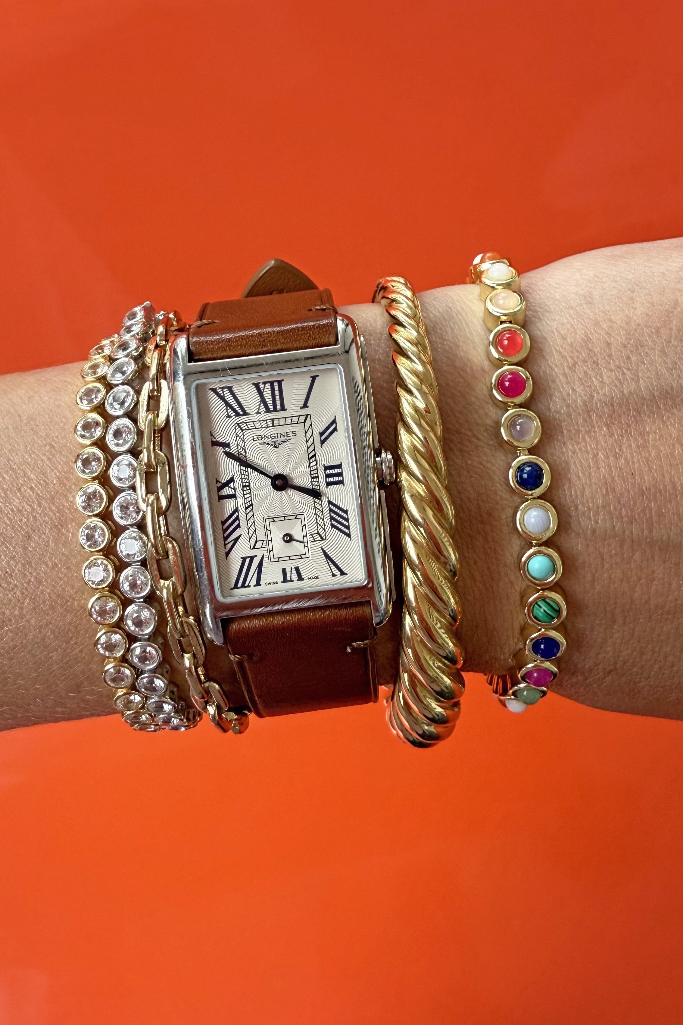 Just as I love layering necklaces, I also enjoy stacking bracelets. Lately, I’ve been wearing the Kate and James bracelets alongside this gold cable bangle, this rainbow bracelet (a fun new addition to my rotation!), and my Longines watch—an everyday classic that pairs with everything.