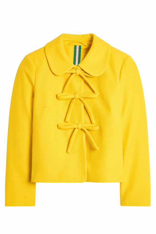 I recently picked up this adorable bow front coat in the happiest, most beautiful shade of yellow. Lately all shades of yellow have been on my radar – from buttery soft serve to bright sunshine to near chartreuse. Scroll down to see all my current favorite shades of yellow. Also, in case you missed it, dresses under $200, Etsy finds of 2025 and a jewelry brand I swear by.
