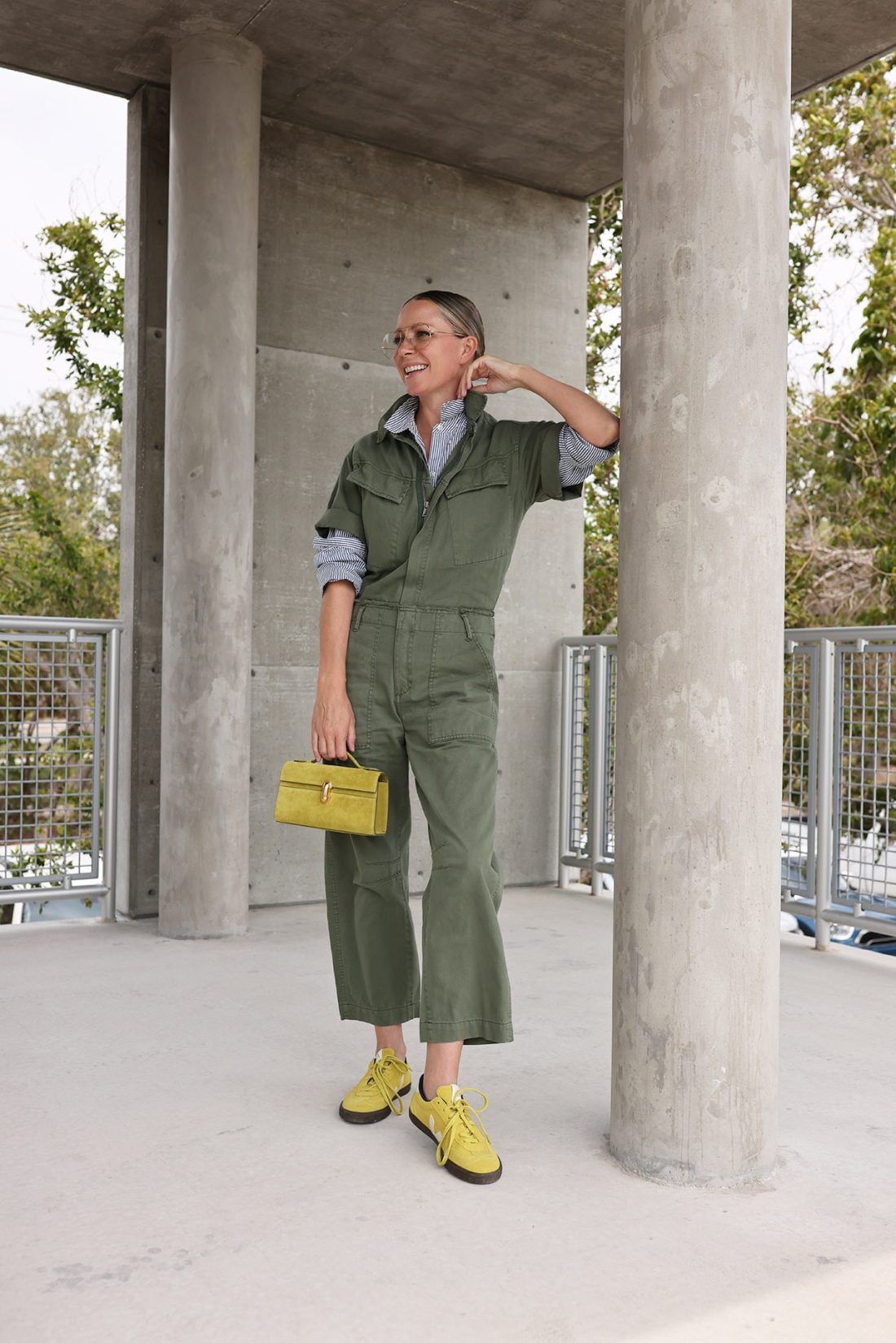 Happy Monday! Kicking off the week in this casual jumpsuit from one of my favorite denim brands. I have received a lot of questions about my favorite denim fits and right now I love the Lexi (15% with my code BLAIR15) as well as the Ally! I popped this olive look with a bit of chartreuse using this bag seen here and these sneakers seen in this mini skirt post. More of my favorite olive finds are below, including these flats that I just scooped up!