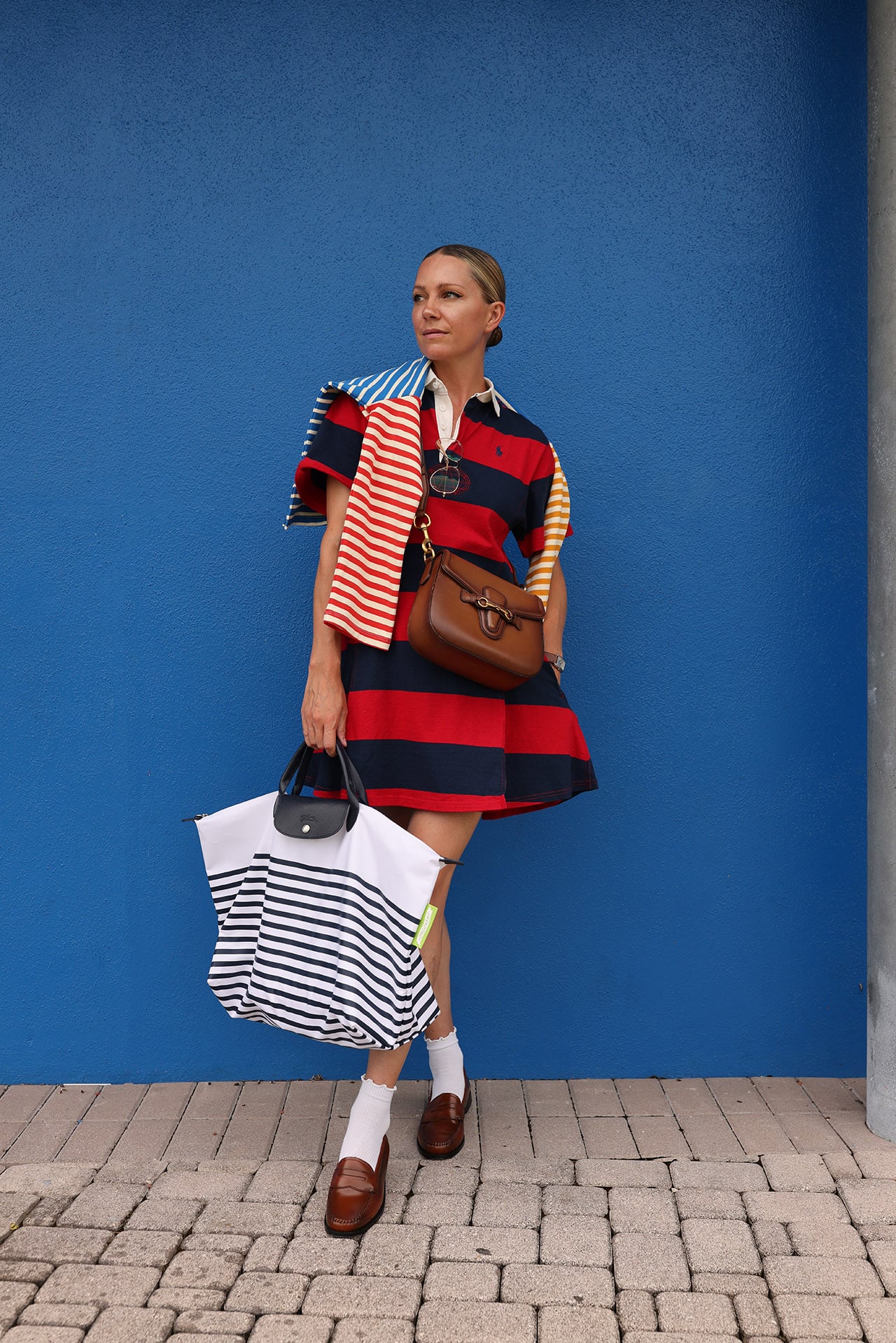 Dress: Polo RL // Shoes: GH Bass // Socks: Amazon // Stripe Mix Top (under $100) // Bag: Gucci (old) // Stripe Bag: Longchamp (also old)
