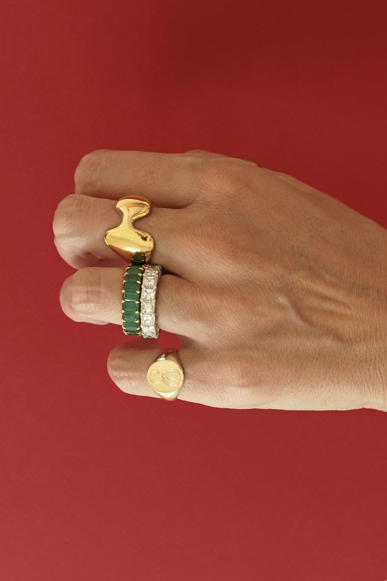 IMAGE THREE: Signet ring (no pave), wave ring and custom diamond and emerald bands.