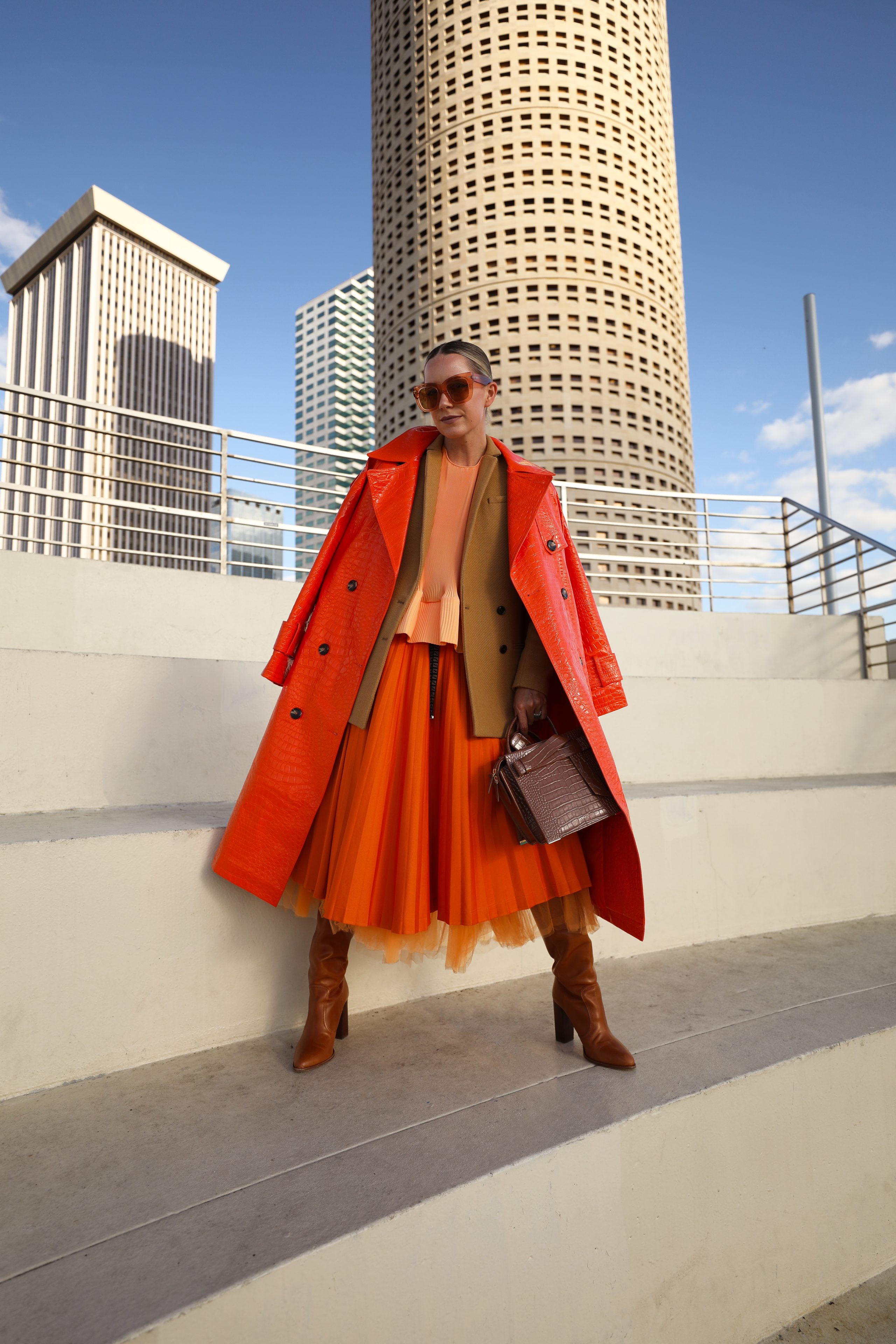 While I probably have every color of the rainbow in my wardrobe, orange and purple are the shades I own the least. That said, I’ve noticed orange trending for fall 2025 – and I’m loving it. It’s the perfect transitional color: it gives off a cozy fall vibe while still feeling bright and cheerful, before the deeper, darker winter palette arrives.