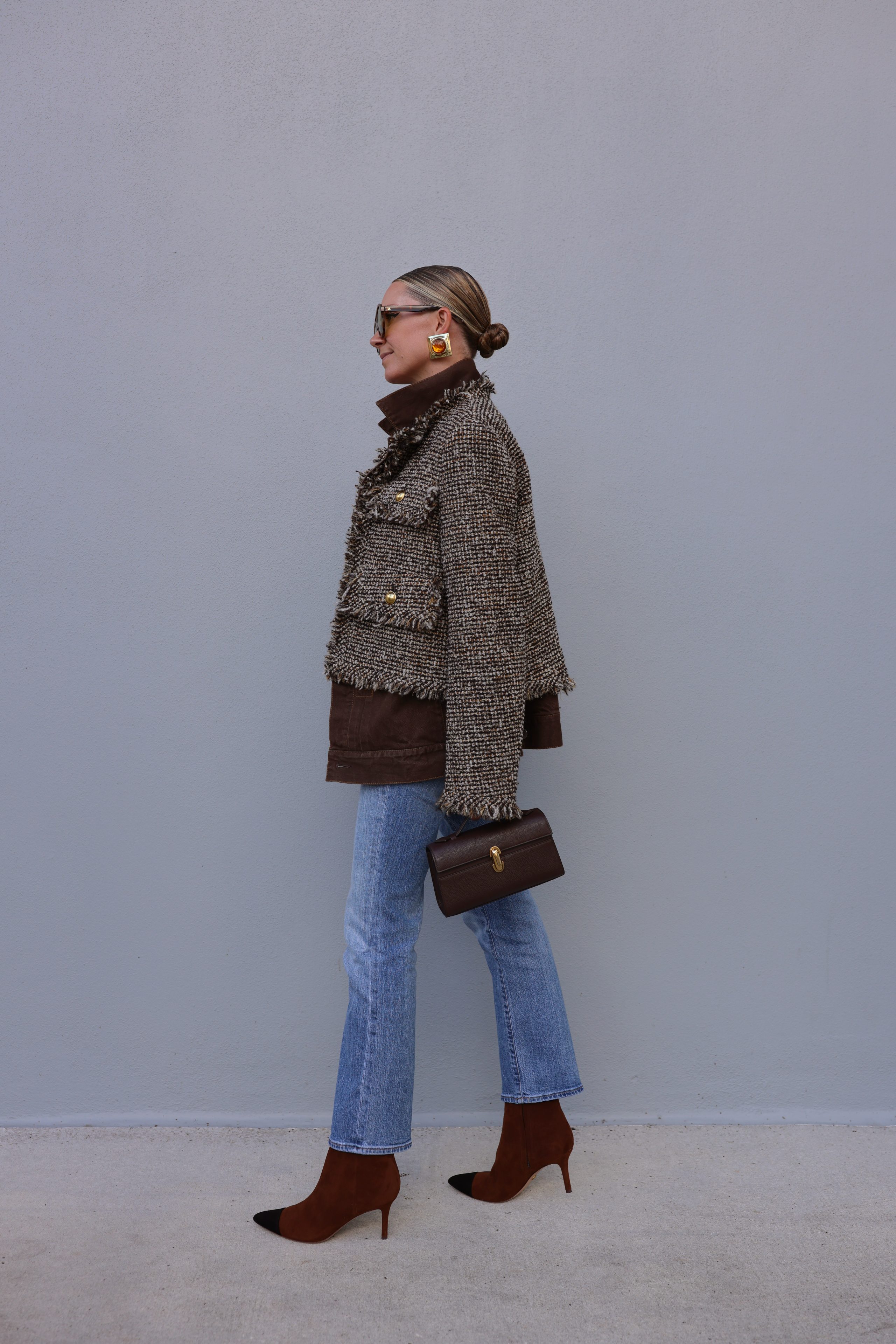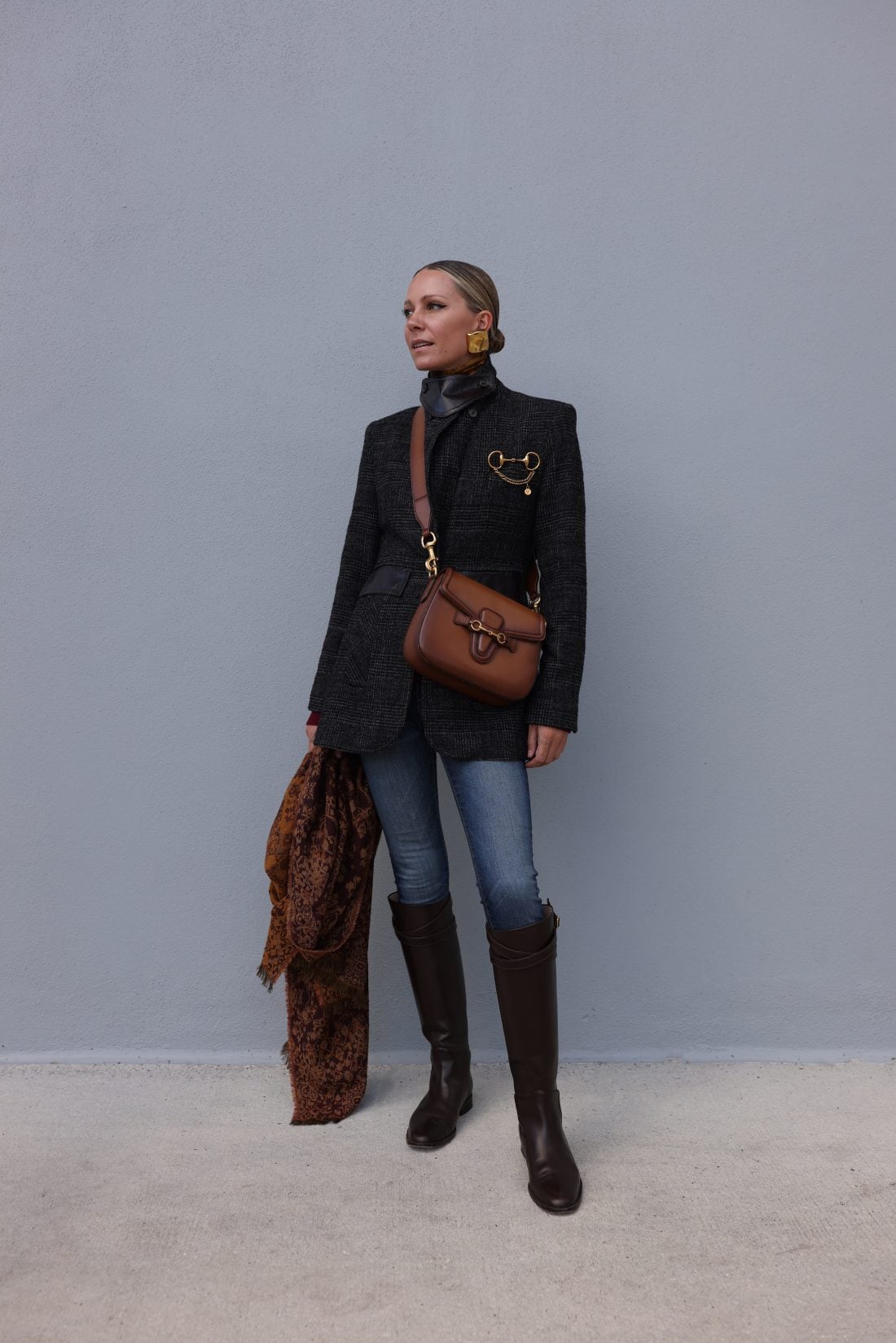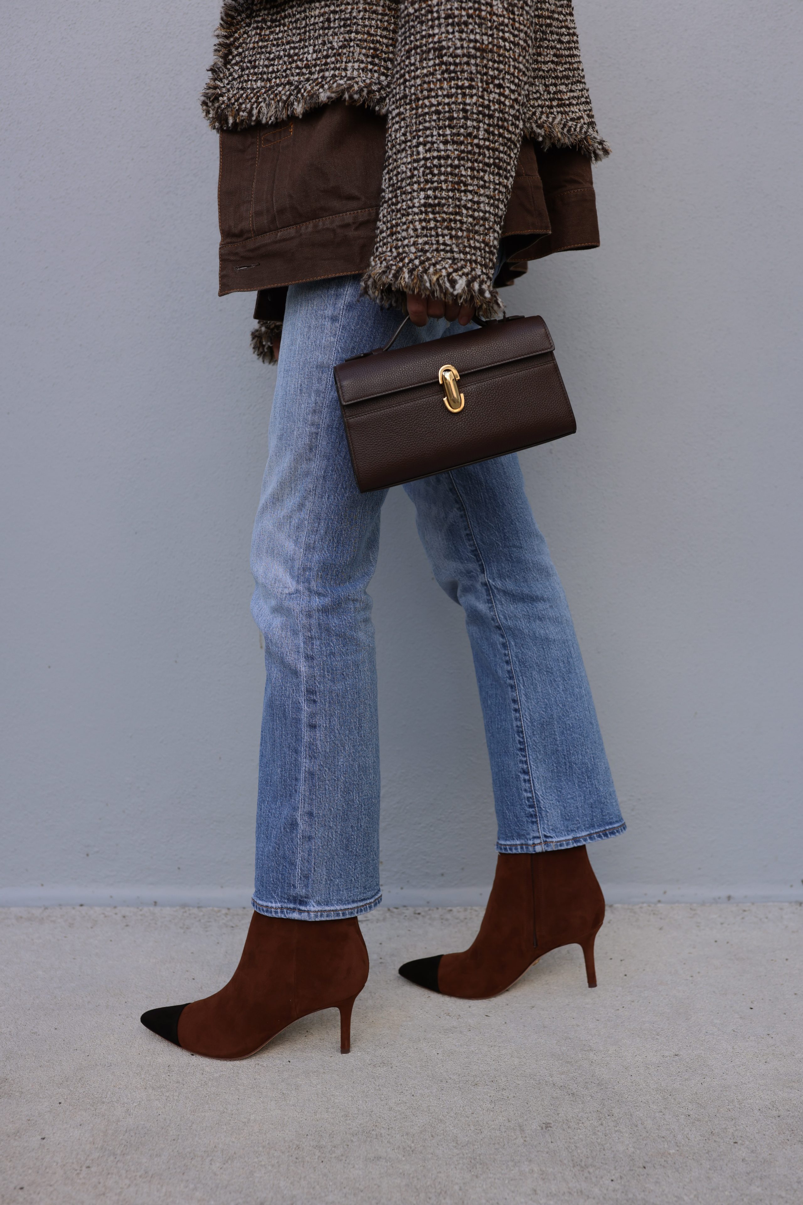 When deciding which boots to wear with jeans, be sure to envision the entire outfit—including your accessories. While I love experimenting with color (and there are so many beautiful hues to wear this fall), I usually try to stay within the same color family when styling boots. That often means avoiding mixing brown and black—though I do combine these in other outfit formulas!