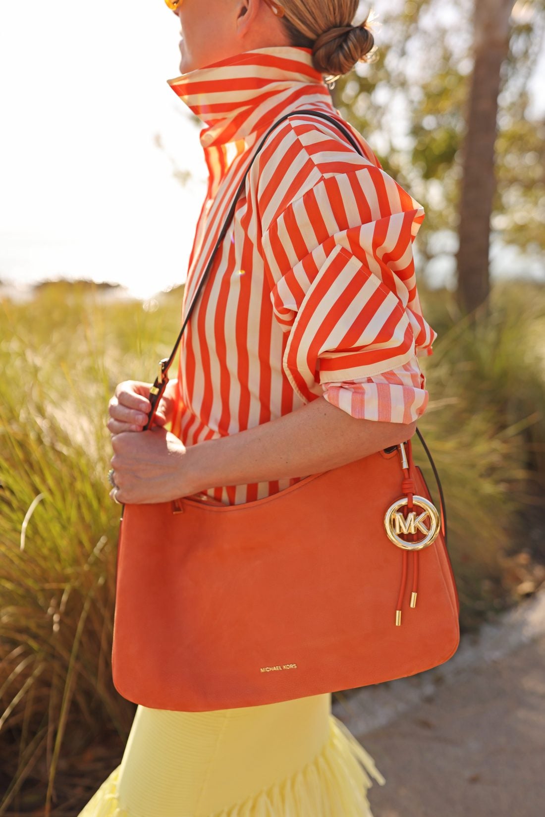 Not too big, not too small – this is the quintessential bag for the girl on the go. I saw this orange and knew I *had to have it*. I love the nubuck material, rich color, and generous shoulder drop that makes it so easy to wear. Shop all the hues here.