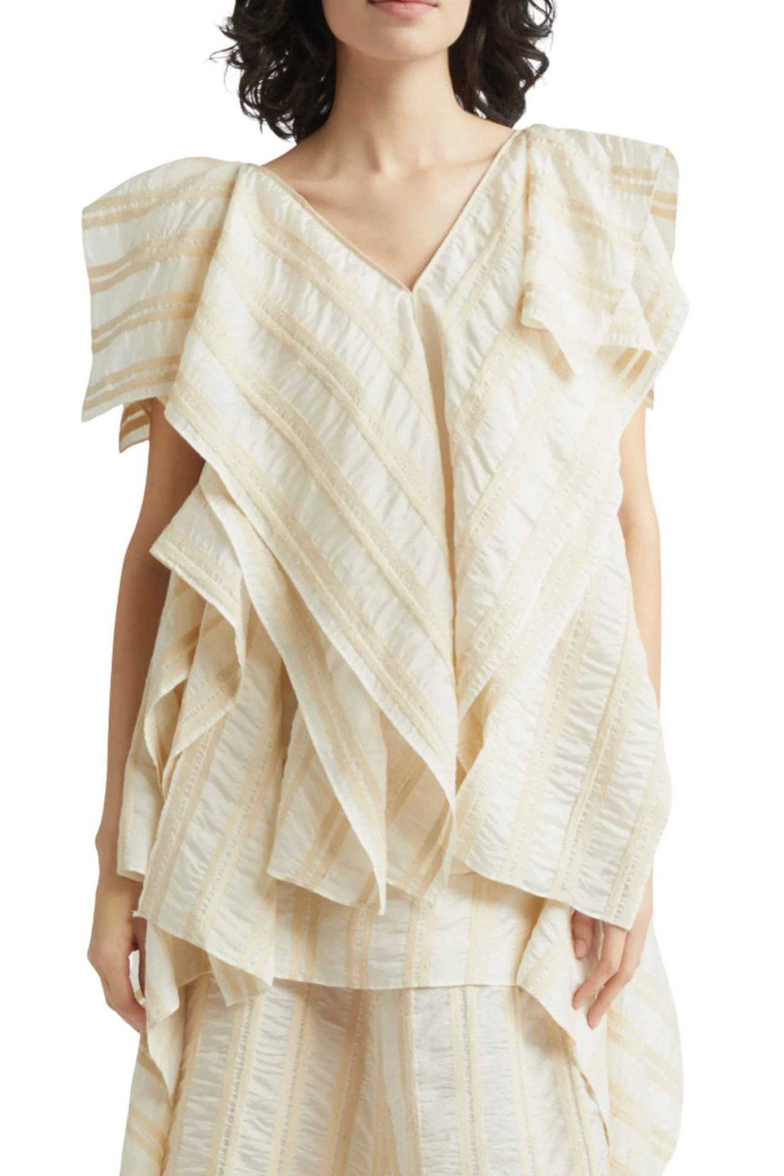 Beige doesn’t have to be boring! This draped top is full of striped diagonal layers. A stunning silhouette!
